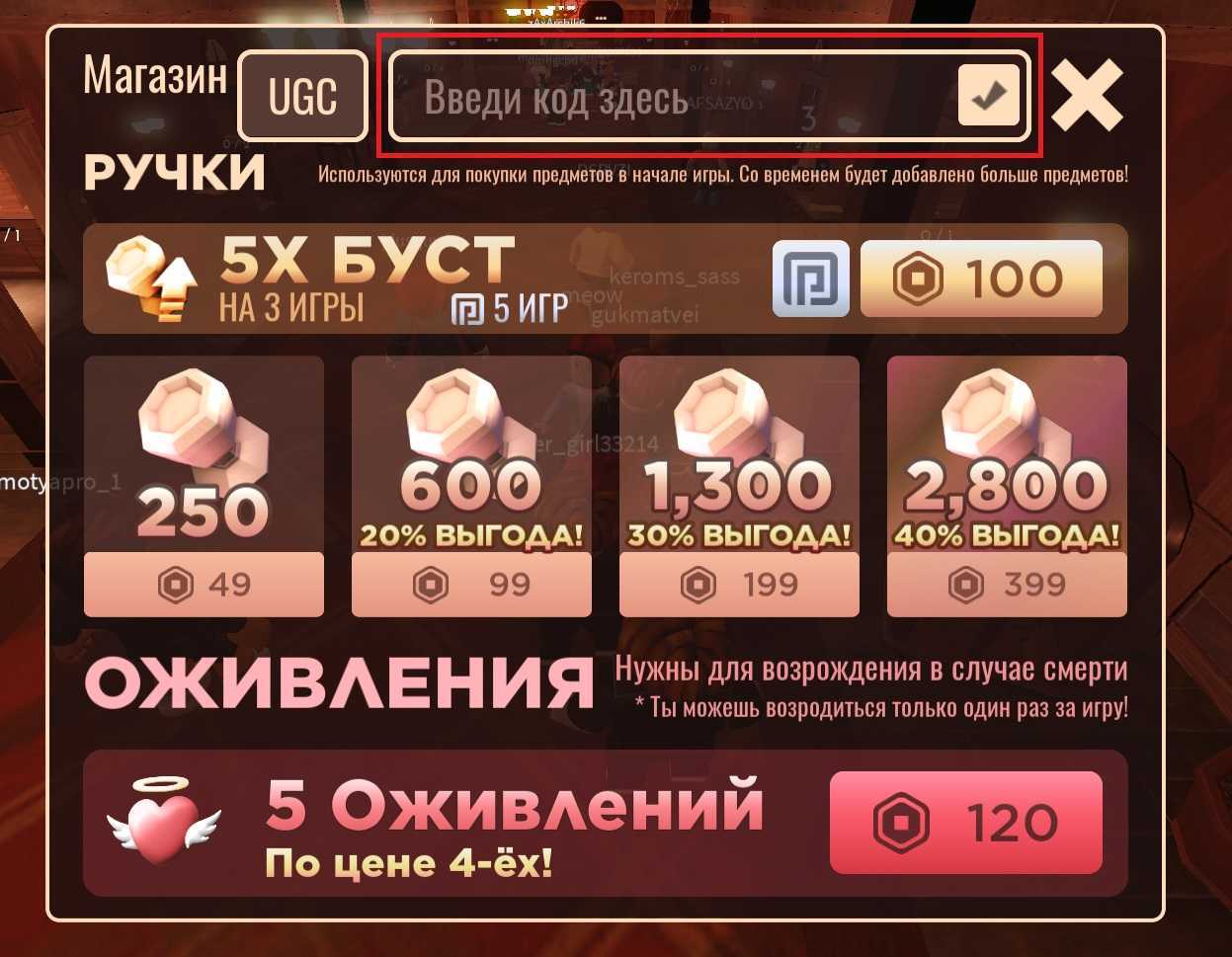 Помимо кодов, общих для всей платформы Роблокс, встречаются пароли для конкретных плейсов. Они открывают доступ к локальной валюте и редким предметам. Такие коды нужно активировать непосредственно внутри игр. Чаще всего поле ввoда находится: