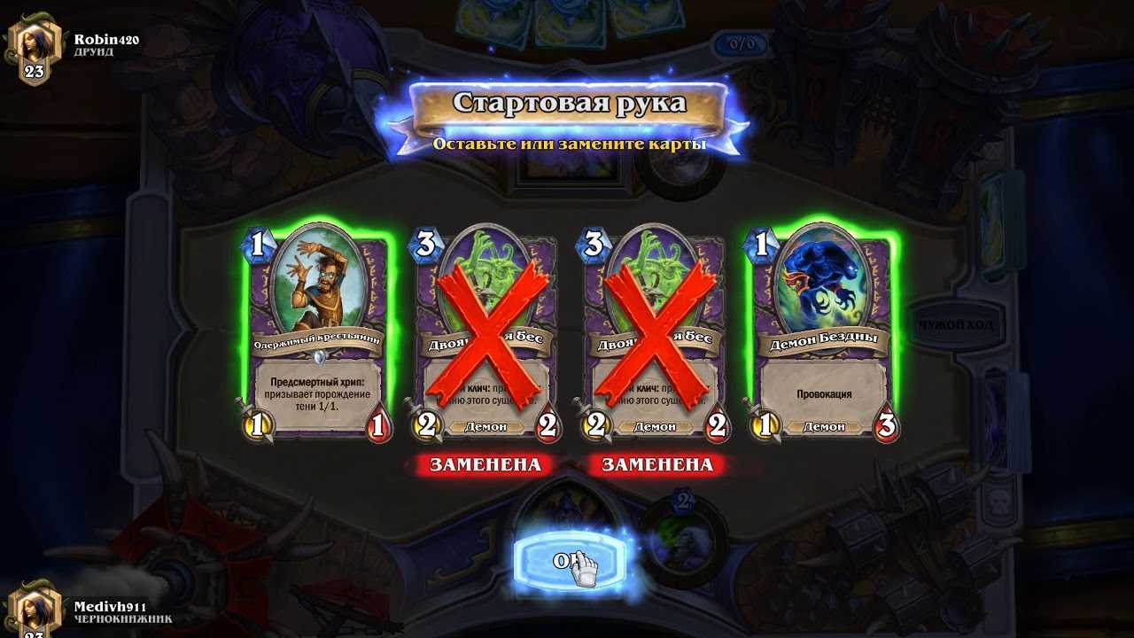 Так в чем же состоит секрет побед агро чернокнижника? Во-первых, вы должны всегда стараться делать так, чтобы в начале вашего хода на доске оставалось хотя бы одно ваше существо.