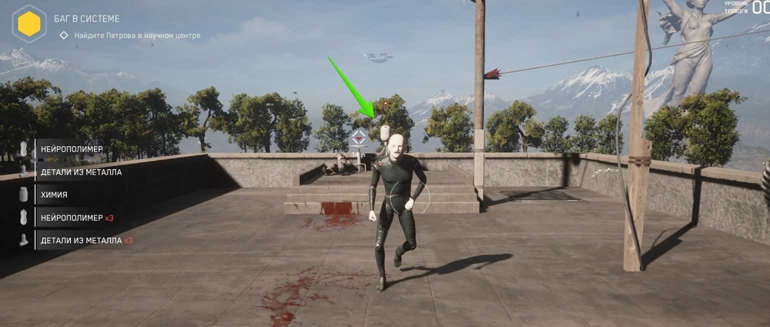Сперва перебейте всех пчёл, затем зачистите локацию. В холле также разберитесь с несколькими волнами врагов и бегите за маркером. В лаборатории с нейрополимером осмотрите труп военного. Рядом лежит аудиозапись.
