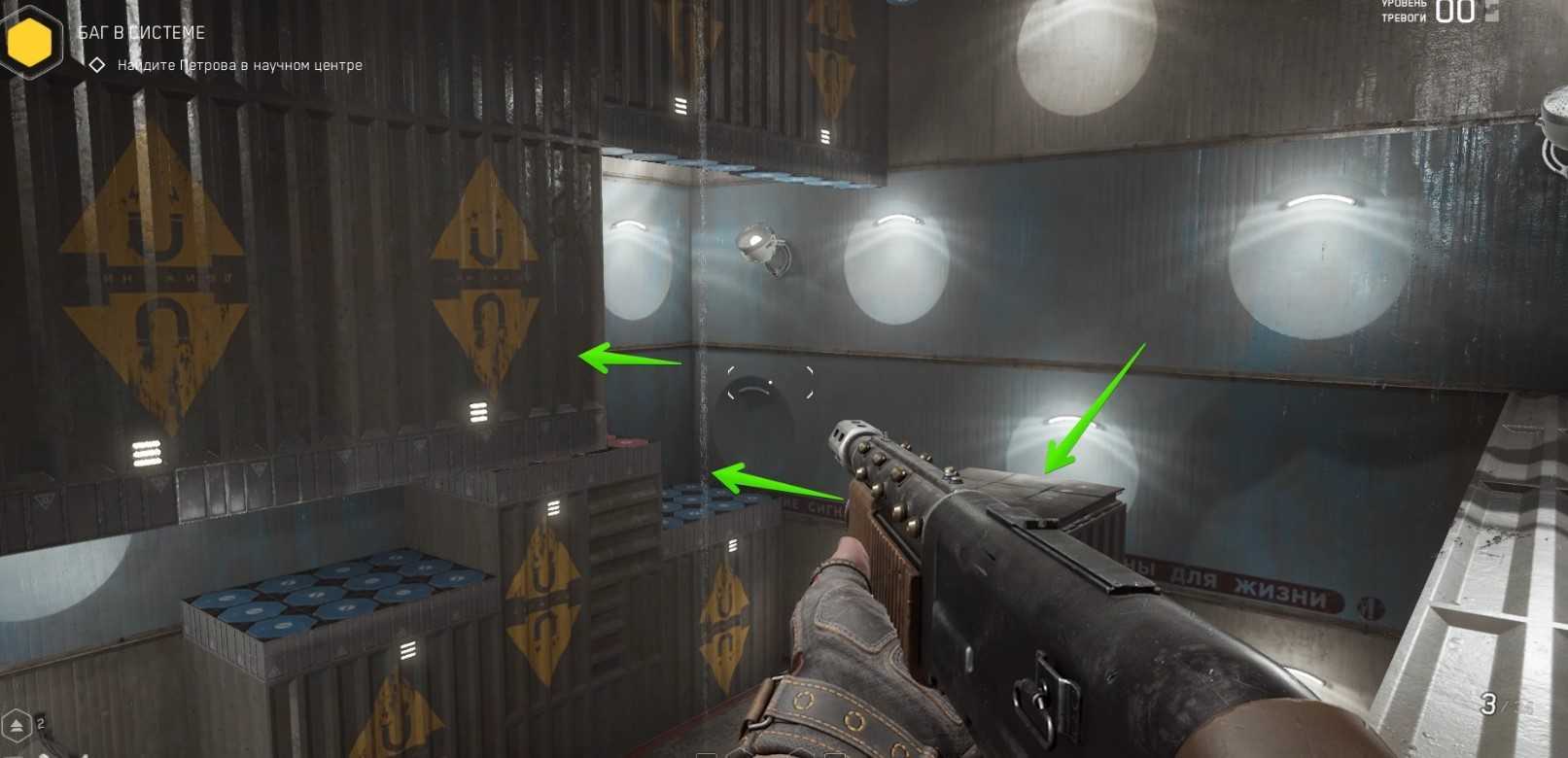 Пройдите через левую дверь, чтобы сохранить, создать ремесло и модернизировать его, или продолжите путь через дверь прямо. Поднимитесь по контейнерам и войдите в комнату, где появятся враги. Победите их всех. Поднимитесь наверх и переберитесь на другую сторону, используя желтые поручни. Войдите в туннель и упадите в новую комнату. Слева находится следующий сундук, в котором лежит Коллиматор для ПМ.