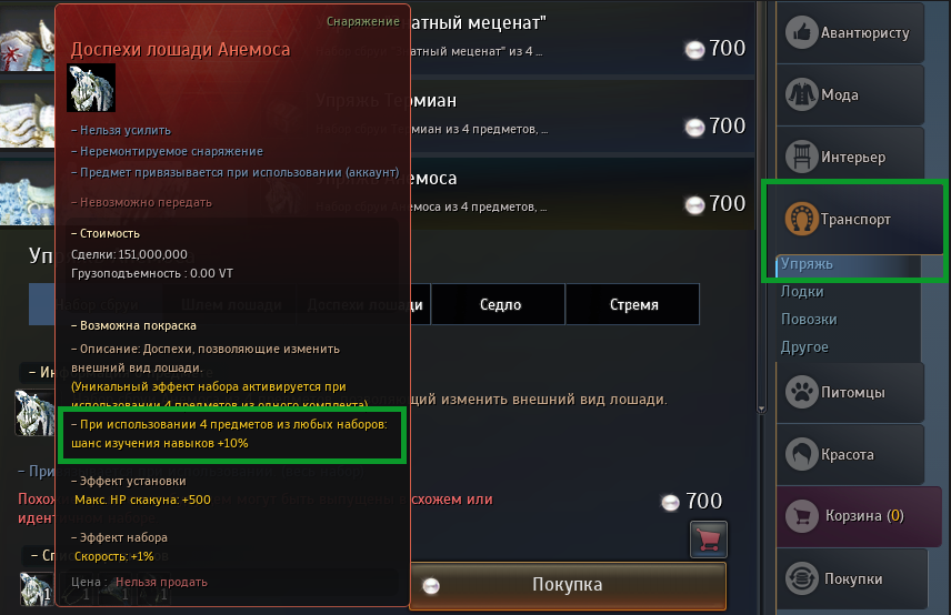 Шлем – ускорение +2%; Доспех – макс. HP скакуна +500; Седло – макс. выносливость скакуна +500; Стремя – поворот +2%.