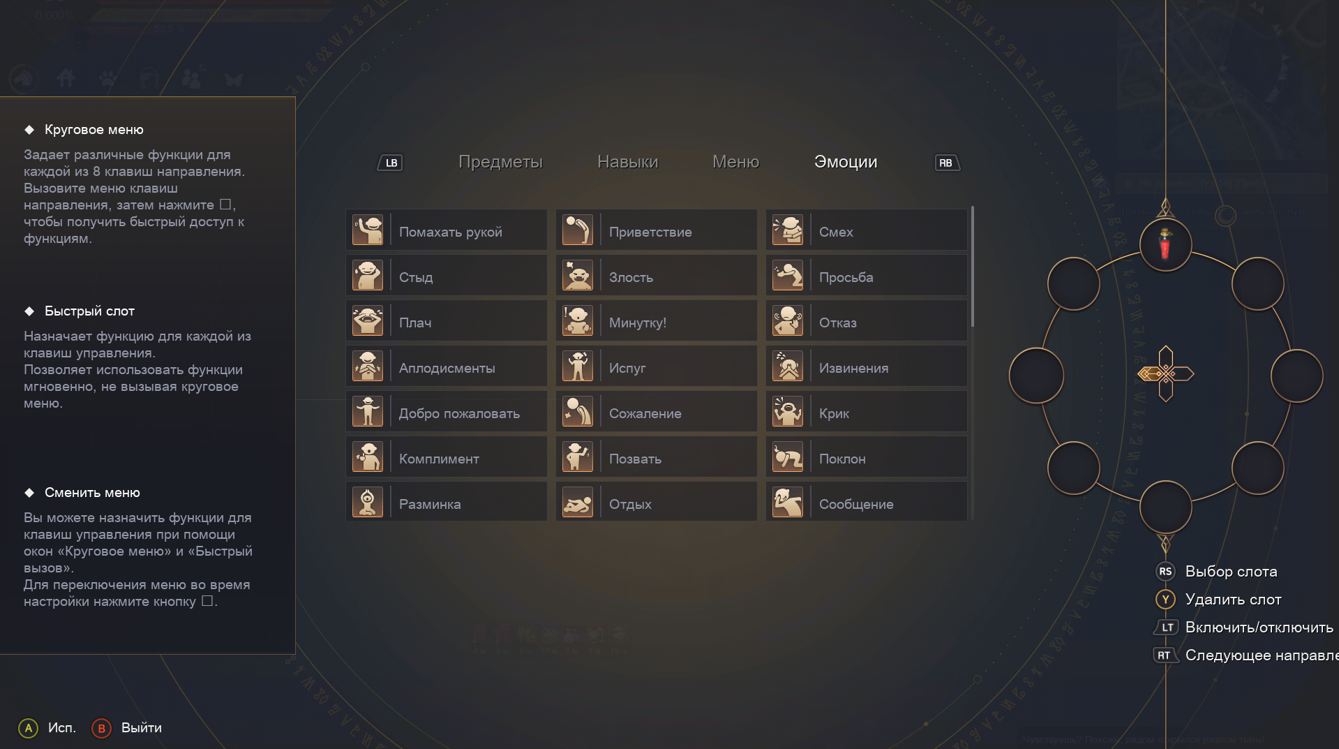 В настройках кругового меню можно изменить круговое меню, настроенное по умолчанию, добавить Зелья HP или другие предметы и навыки в пустые слоты кругового меню, а также настроить использование эмоций.