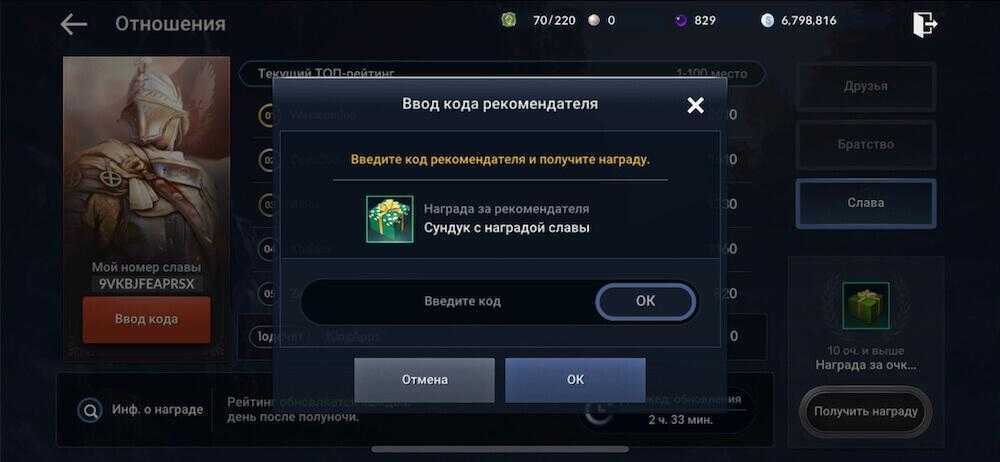 Вводить нужно тут: Меню — Отношения — Слава — Ввод кода (кнопка). И обязательно, вы должны быть в городе, при этом. Не в лагере, не на поле битвы, ни на арене, а именно в одном из городов.