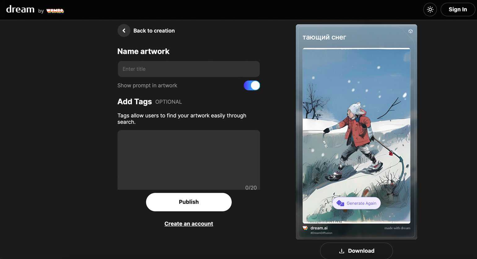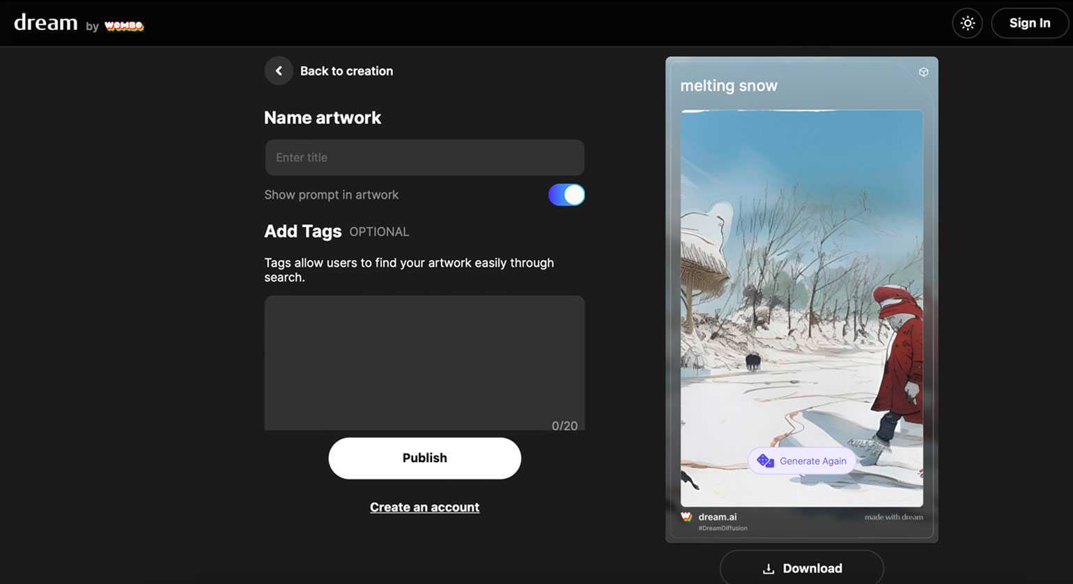NightCafe удобна для начинающих и имеет простую в использовании использовать интерфейс. Просто войдите в свою учетную запись NightCafe, создайте свою работу и создайте уникальную ссылку, чтобы опубликовать свою работу и выставить ее на продажу на других платформах.