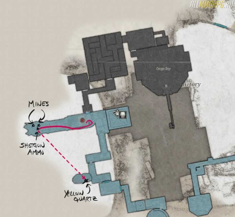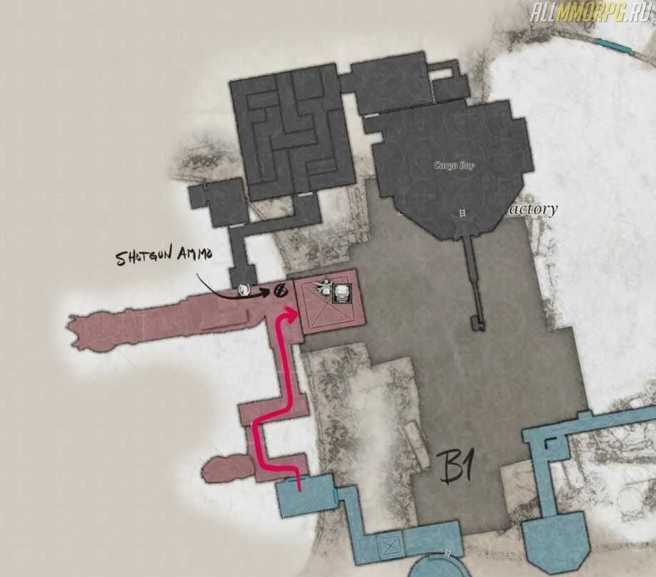 Еще повернитесь назад и идите на запад, а после на юг по дорожке от шахты лифта. Спрыгните на трубу внизу и идите на запад. Там найдете патроны для дробовика и несколько мин.