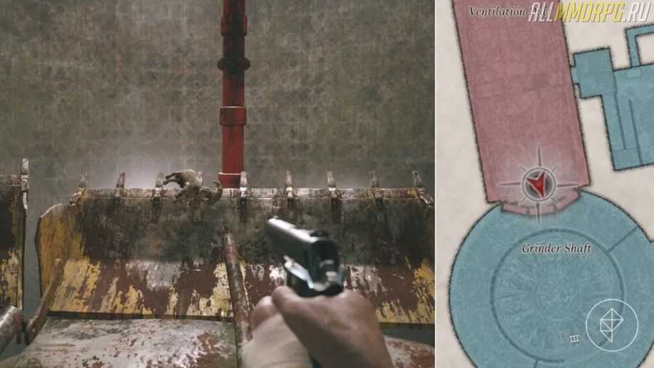 Наверху вы найдете карту верхних этажей. В этом же помещение отодвиньте вагонетку, чтобы попасть в вентиляционную шахту. Там вы найдете шаблон шара.