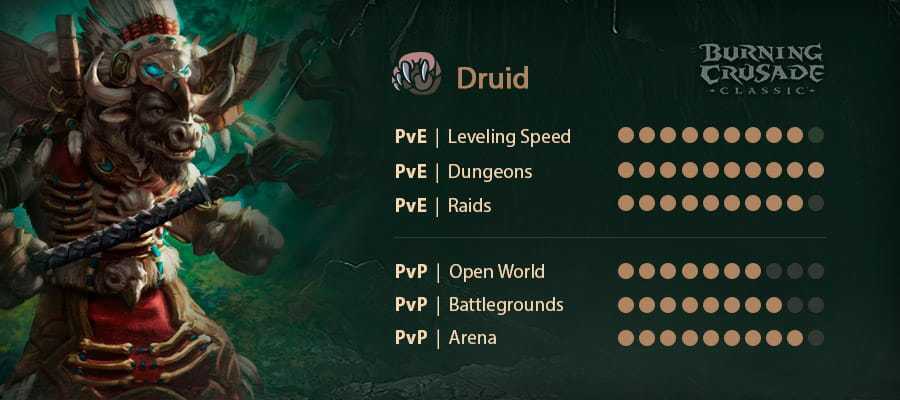 В PvE У друидов есть мощная полезность, возрождение, также известное как бойцы — способность буквально вернуть кого-то к жизни во время боя, у них также есть Innervate, которое является мощным заклинанием регенерации маны. Друиды также обладают высокой эффективностью маны и обеспечивают периодическое исцеление заклинаниями, а также отличное рейдовое исцеление. Помимо ресто, друиды-звери могут танковать подземелья и рейды. Мы думаем, что дикие друиды — это не только отличные танки, но и отличные основные танки, особенно в более поздних патчах Burning Crusade, и даже в классическом WoW мы видели, что танки друидов отлично справляются. Так что действительно друид отлично подходит для танкования или глубокого дпс.