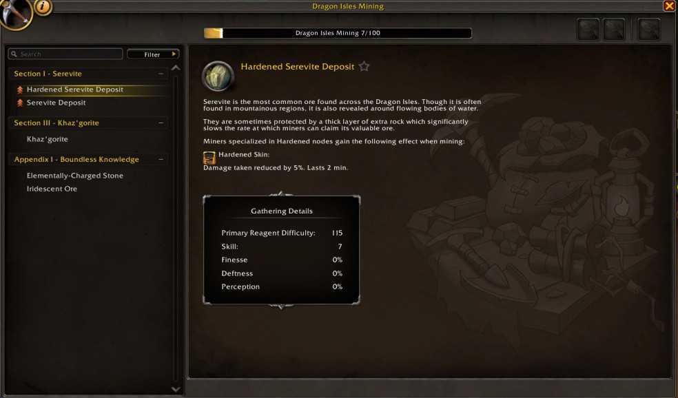 - Металлургия. Эта специализация направлена на повышение ваших навыков обращения с различными металлами, а также может помочь вам в переработке руд. Вы можете специализироваться на серевите или дракониуме, оба из которых увеличивают ваши характеристики при взаимодействии с соответствующим узлом. Первый может вознаградить вас драгоценными камнями, а второй — пробуждающими эссенциями.