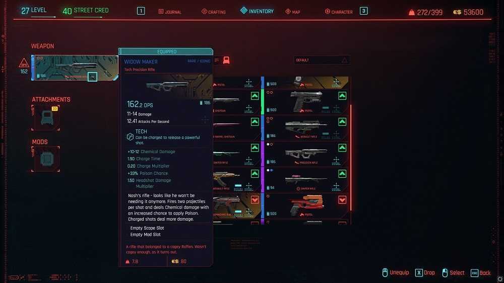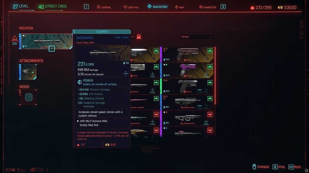 Пожалуй, бесспорно, лучшая снайперская винтовка в Cyberpunk 2077 – Надзор. Кроме внушительных показателей урона оружие может похвастаться высоким риском вызвать кровотечение, что окажется полезным в случае, если пуля попала в тело, а не голову. Что еще радует, так это высокая скорость перезарядки. Но главная особенность Надзора – встроенный глушитель, из-за чего нет необходимости дополнительно модифицировать оружие для бесшумной стрельбы и тем самым понижать урон от выстрелов.