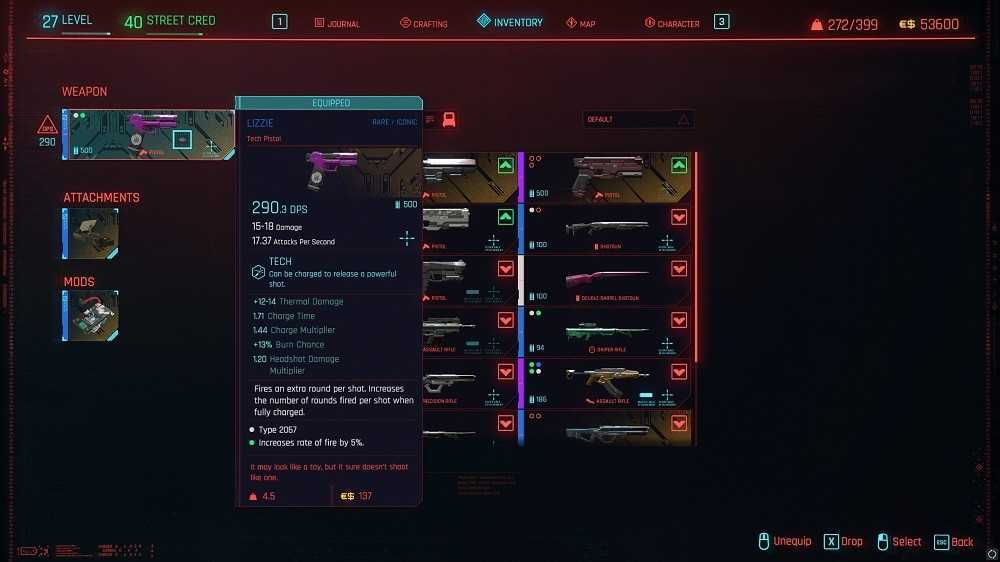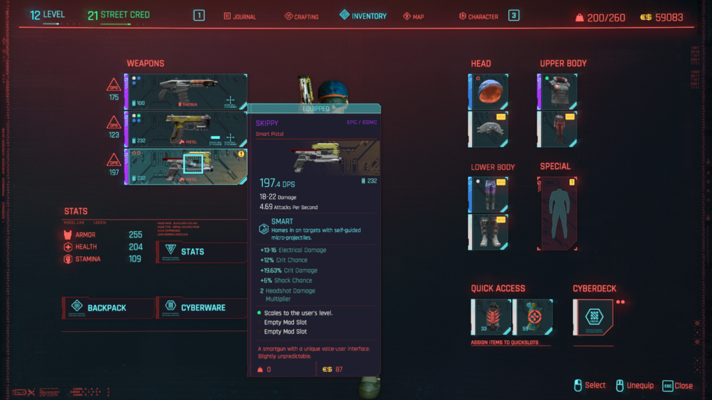 Скиппи – уморительный пистолет, который сможет вести с Ви несложные диалоги и давать едкие замечания по поводу его стиля игры. Кроме того, что Скиппи – отличная находка сценаристов, это также чуть ли не лучшее оружие в Cyberpunk 2077. По крайней мере среди вооружения «умного» типа ему нет равных. Работает пистолет в двух режимах: «Хладнокровный убийца» и «Пацифизм и щеночки». Первый режим – стреляет исключительно по головам, второй – целится по коленям. Разумеется, первый режим более действенный и если вы его выберете, то будьте готовы, что со временем Скиппи начнет с вами диалог по поводу вашего в прямом смысле убийственного стиля игры, и если хотите оставить включенным режим «Хладнокровный убийца», то даже не думайте в разговоре проявлять пацифистские качества. Чем выше уровень Ви, тем выше урон пистолета.