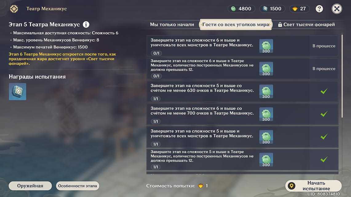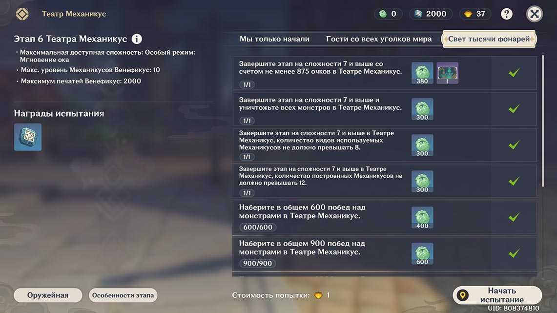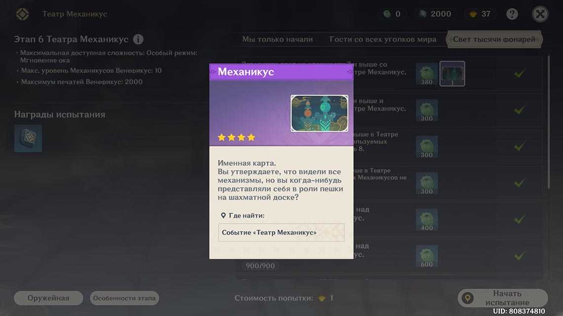 «Театр Механикус» — многоуровневая игра, поэтому вам понадобится выполнить серию квестов каждый раз, когда будет начинаться очередная стадия «Праздника морских фонарей». Чтобы запустить свой первый матч, завершите задания «Откуда появились фонари» и «Ли Юэ: Театр Механикус». Тестовый забег бесплатный, за каждый последующий вход используется по одному небесному фонарю.