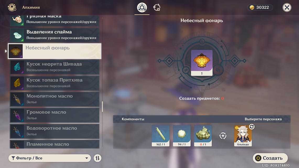 Небесные фонари в Genshin Impact крафтят с помощью алхимии из трёх ресурсов: волокна для фонарей, пуха для фитиля и осколков плаустрита. Волокно выпадает при сборе растений, пух — из различных хиличурлов и элитных Фатуи, осколки — при сборе руды, с молодых и взрослых геовишапов, а также лавачурлов с каменным панцирем.
