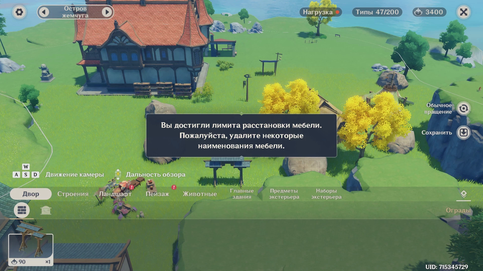 В этом режиме можно свободно перемещать камеру по острову, а также менять углы обзора и приближение. Чтобы обустроить дом, нужно в него зайти. При этом чтобы обустроить отдельную комнату, нужно находиться в этой комнате.