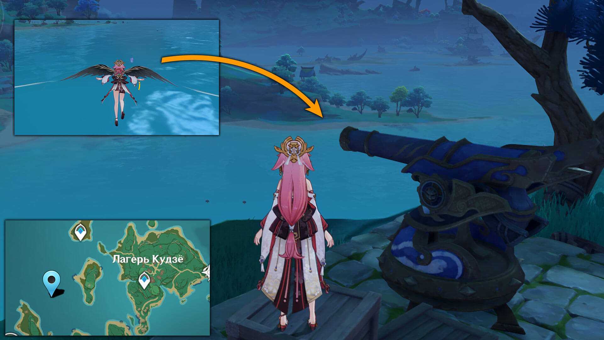 7. Электрокул плавает в воде между островами. Можно доплыть на волноходе или забраться на вершину восточной горы, где находится пушка Камуйдзима, и долететь.