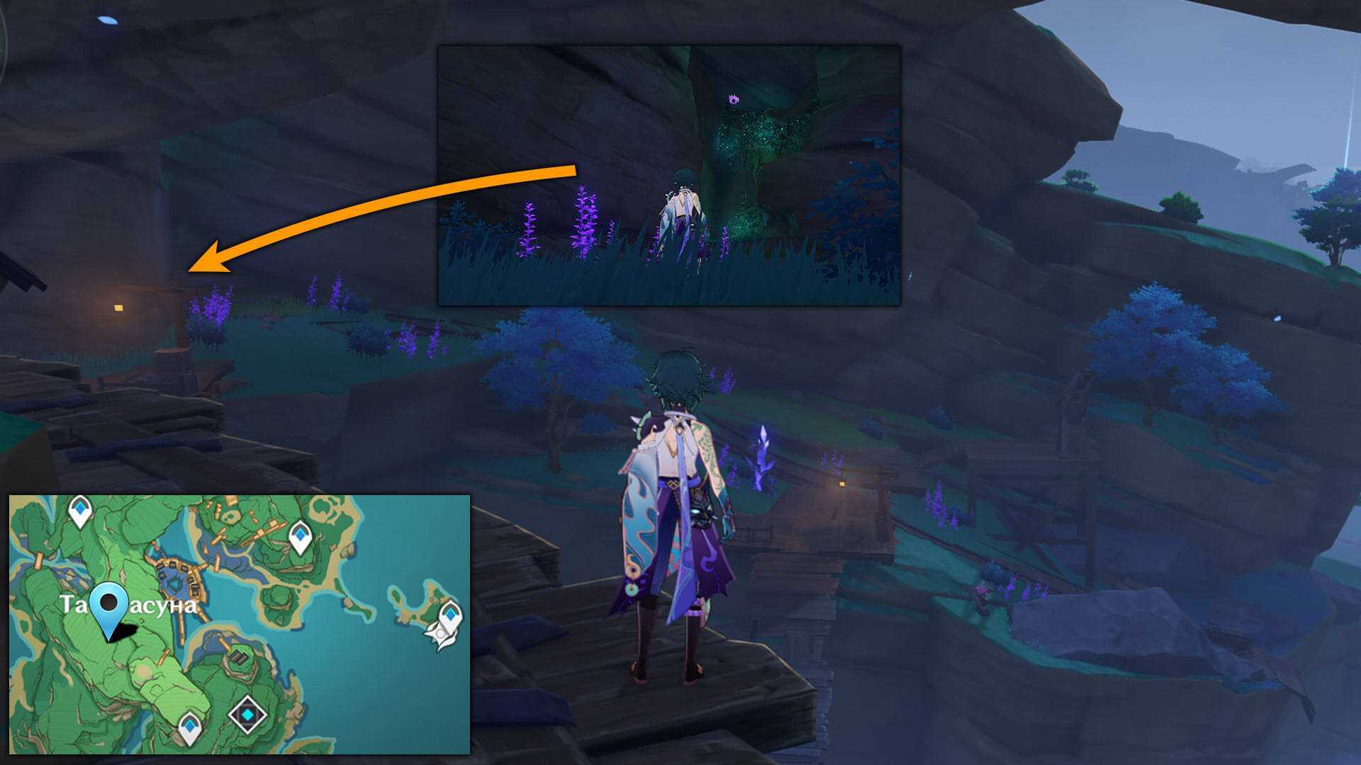 14. Недалеко от Громовой сакуры есть вход в пещеру. Электрокул находится рядом с самураем искусства Ивакура: Танба Тэцуо. Если вход найти не получилось, то можно зайти со стороны побережья.