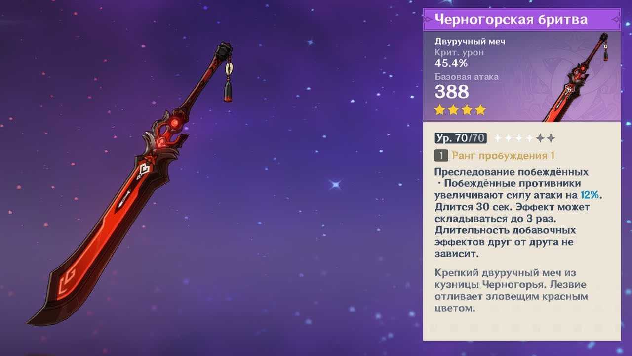 Это фирменный меч любого наносящего урона, который постоянно находится в бою и наносит тяжелый урон. Эола, Дилюк, Ноэль, Бритва — с таким оружием в руках эти ребята будут практически непобедимы. Однако следует учитывать, что в битвах с боссами и одиночными толстыми противниками черногорская бритва не так эффективна, ведь ее бонус зависит от убийств.