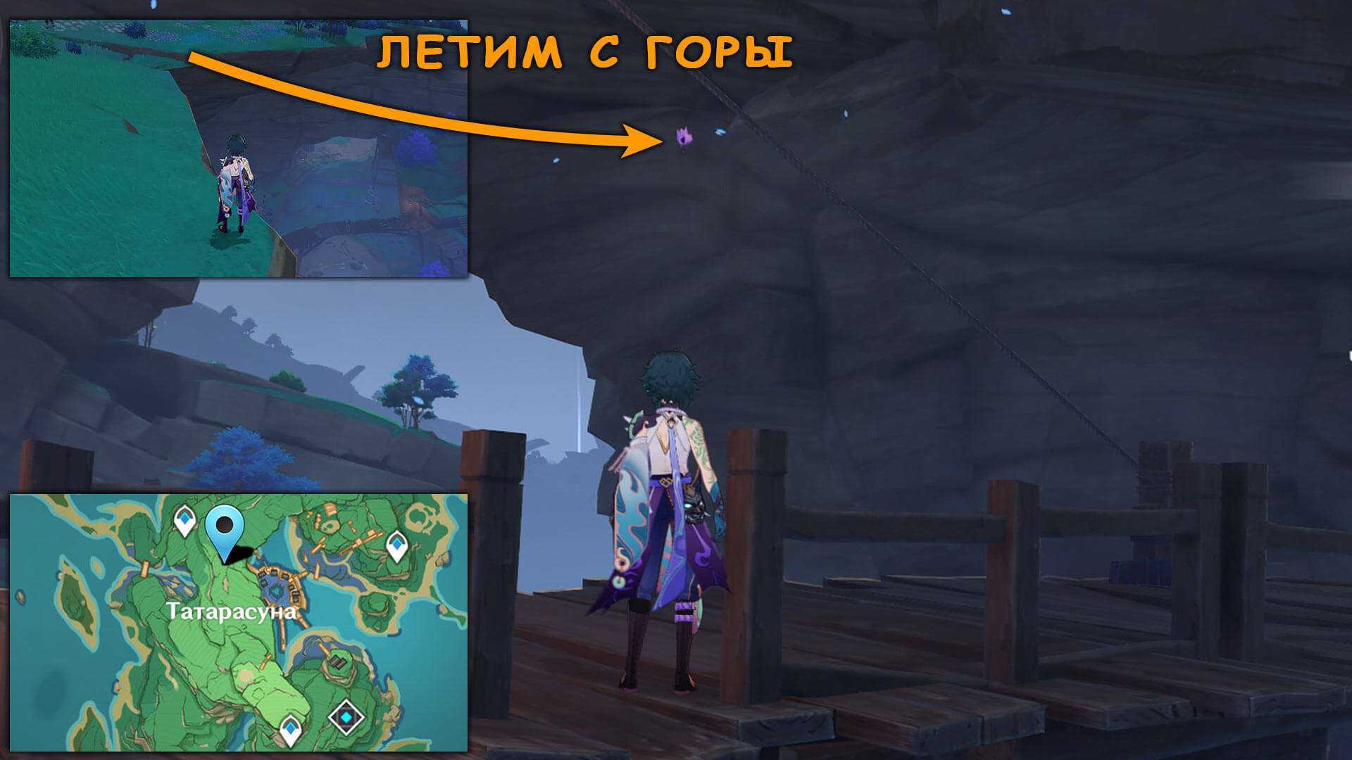 26. От Точки телепортации на вершине прыгаем вниз и парим под скалу.