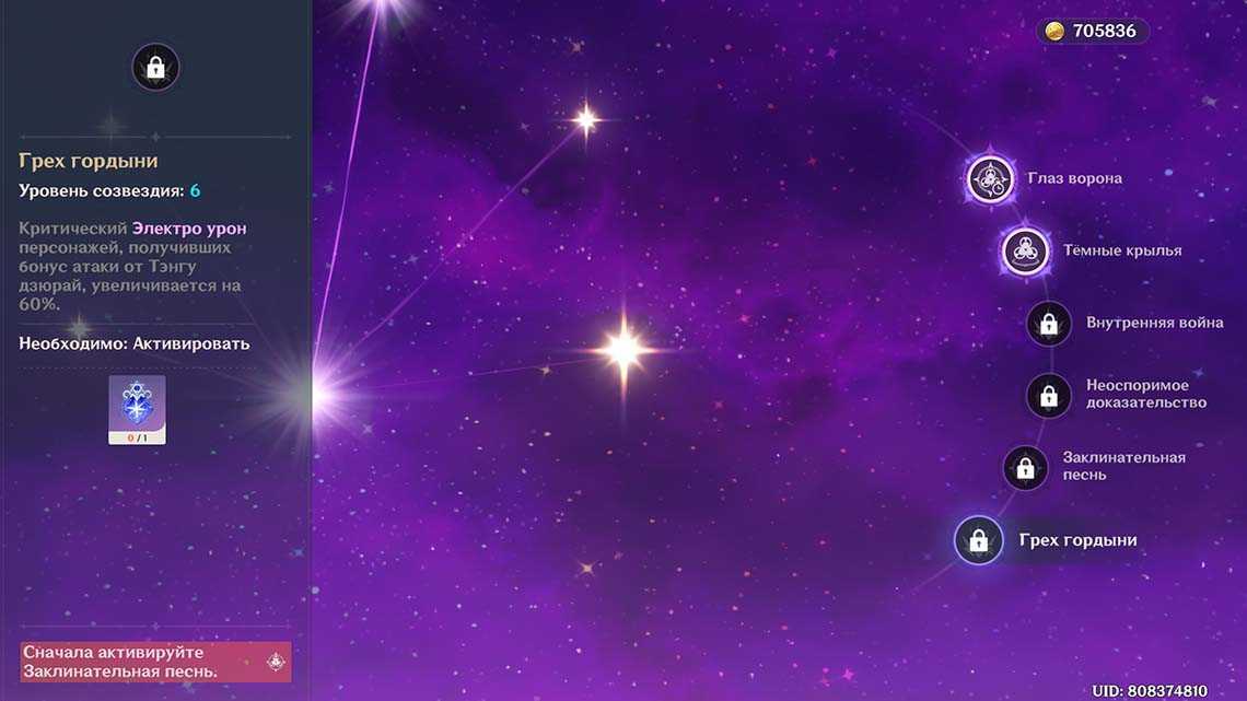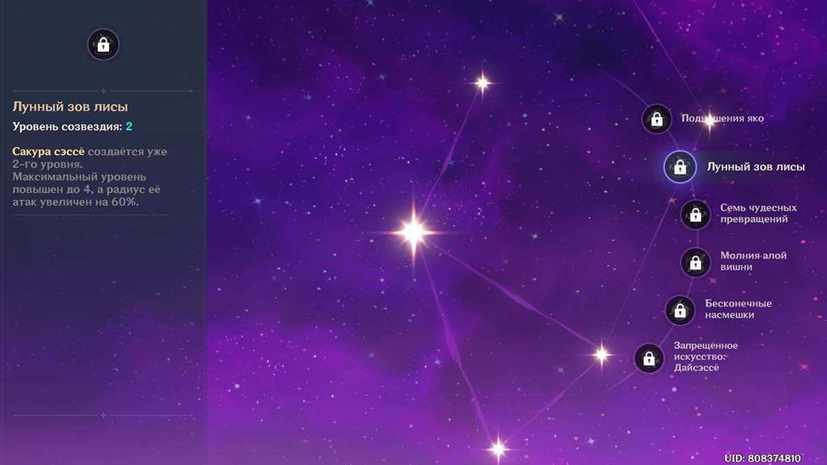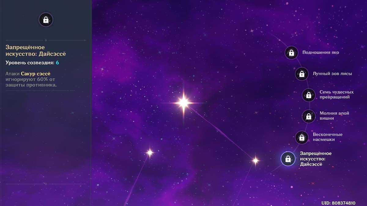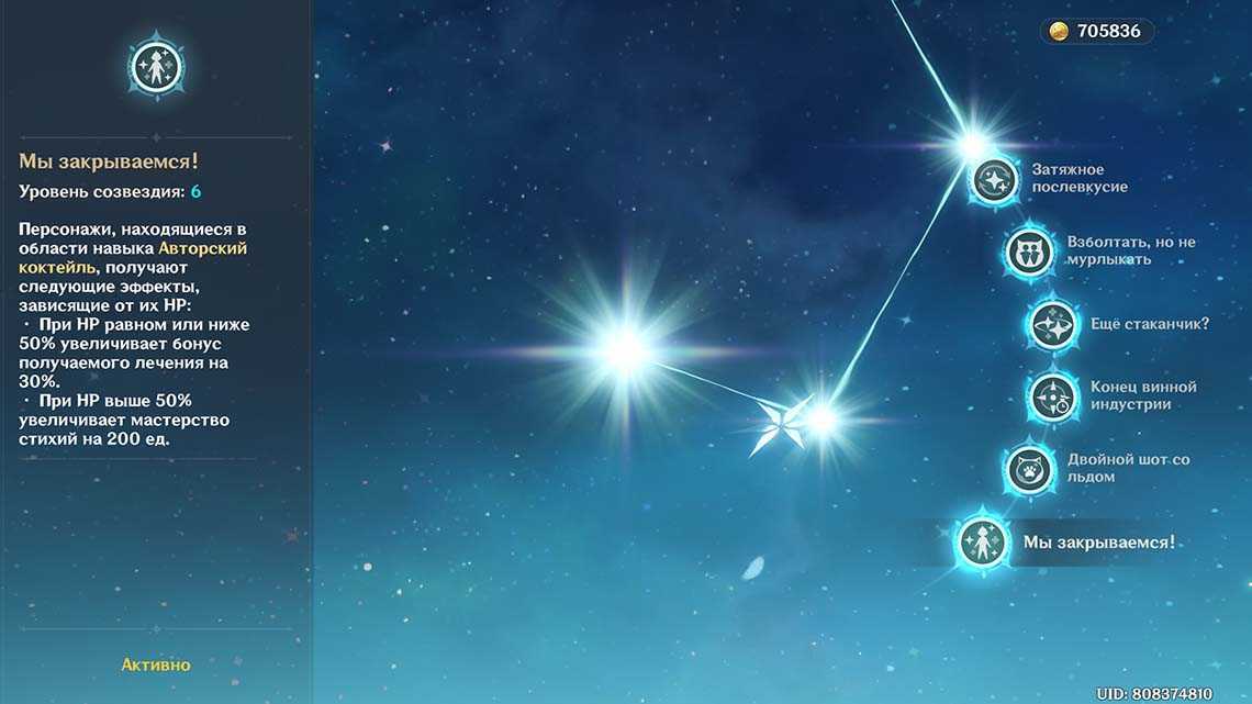 - №2 «Странствия в компании». При первом попадании Стрелы потока инея от «Вихря звездного света» или попадании Сигнала ледяной звезды по врагу «Выслеживание» получает +1 ур. Чтобы это созвездие работало, вам необходимо открыть пассивный талант Мики «Подавляющий обстрел».