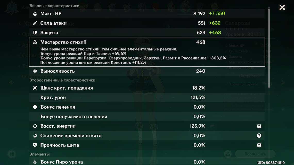 Сахароза — стягивание мобов, активация реакции «Рассеивание», повышение мастерства стихий. За счёт мастерства стихий поднимается урон Сакур сэссё. Например, 500 МС увеличит урон каждого «тотема» на 75%.
