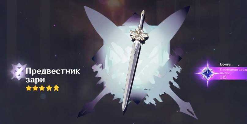 - Предвестник зари (3-звездочный) – повышает вероятность нанесения критического урона на 14%, когда уровень здоровья выше 90%. Лучший меч при игре за Альбедо, направленного на защиту и создание стихийных реакций.