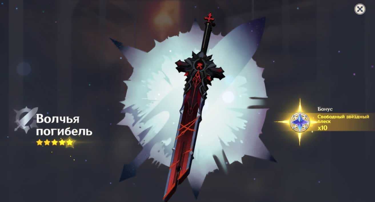 Волчья погибель (сила атака) — ещё один жизнеспособный вариант, если у вас уже есть этот меч. В идеале это оружие лучше использоваться с Дилюком (гайд на Дилюка) или Рэйзором (гайд на Рэйзора), но для Эолы он тоже подойдёт.