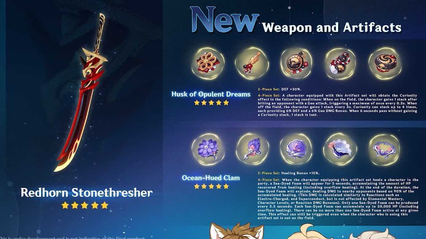 | Кокон сладких грез | Бонус из 2 частей: ДЕФ +30%. Бонус из 4 частей: Персонаж, экипированный этим набором артефактов, получает эффект Любопытства в следующих ситуациях: 1 уровень Любопытства даётся активному персонажу после попадания по противнику атакой Гео (не чаше чем раз в 0,3 сек.); когда персонаж находится вне поле боя, он получает 1 ур. Любопытства каждые 3 сек. Любопытство может складываться до 4 ур., каждый ур. прибавляет 6% к защите и 6% к Гео урону. Если персонаж не получает Любопытство в течение 6 сек., то он теряет 1 накопленный уровень Любопытства. |