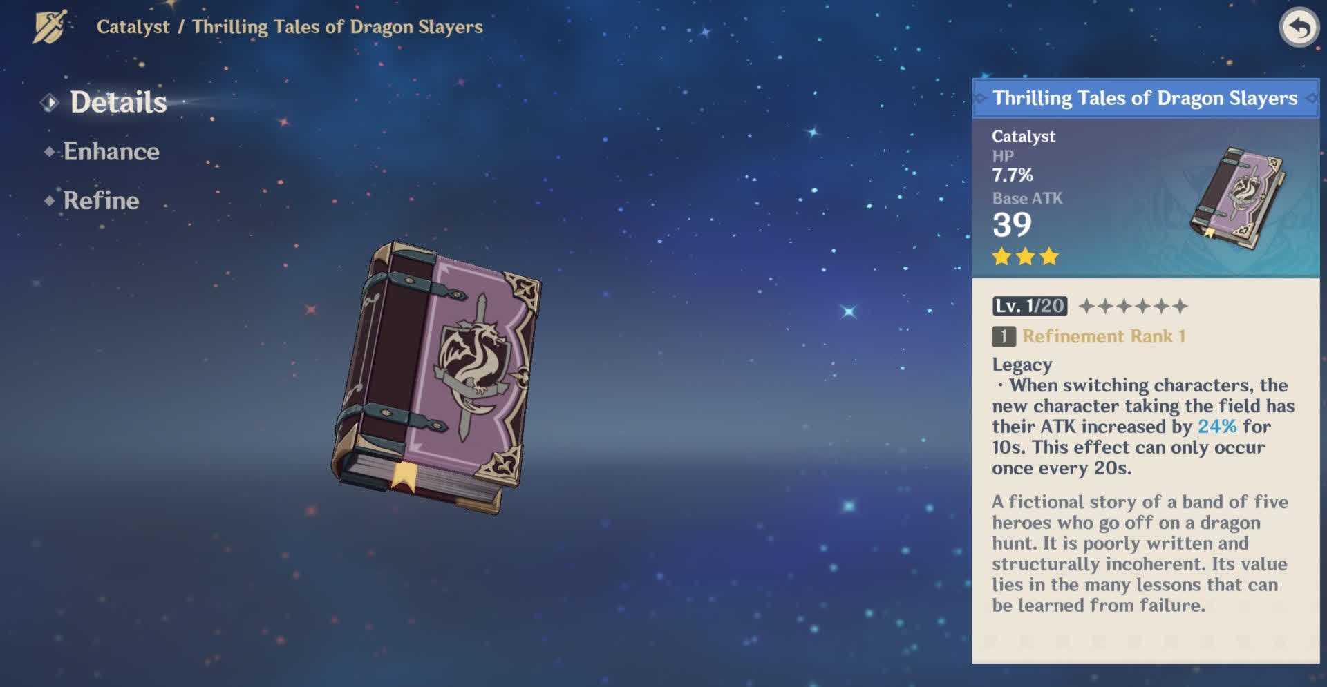 - Эпос о драконоборцах (3-звездочный) – после переключения персонажа увеличивает силу атаки нового активного персонажа на 24/30/36/42/48% в течение 10 секунд.