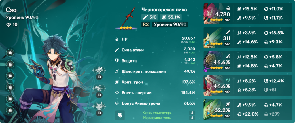 Будут лучшей комбинацией из доступных нам на данный момент. Изумрудная тень даст приятную прибавку анемо урона, а Конец гладиатора или Воспоминания Симэнавы поднимут параметр атаки.