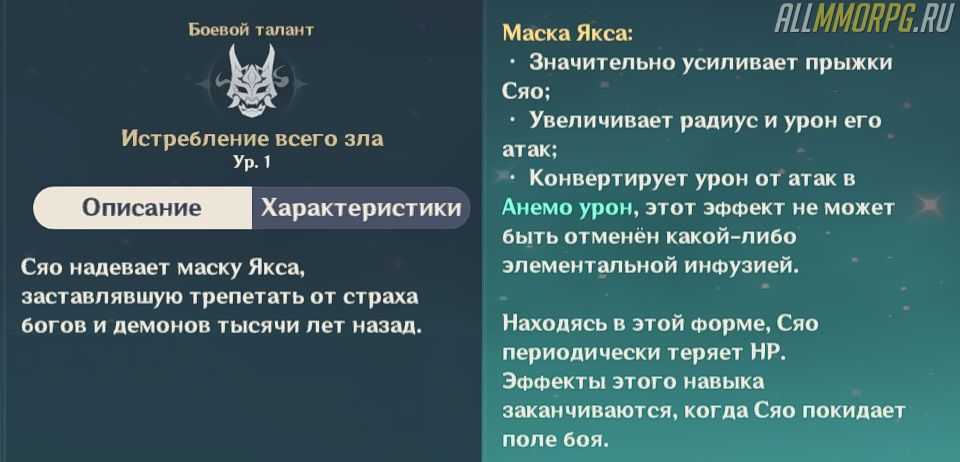 «Истребление всего зла» – ультимейт героя. После активации способности Сяо надевает маску Якса, которая: