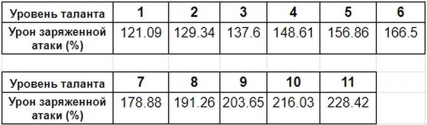 Масштабирование урона при прокачке таланта Сяо «Вихревой удар» (обычные, заряженные и удары в падении):