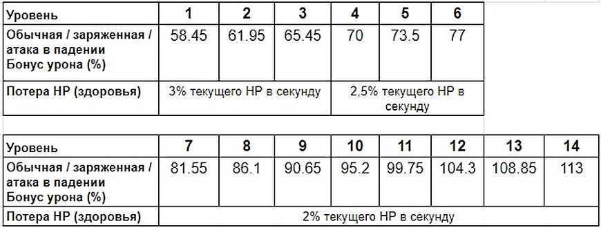 | Расход ХП | 3% от текущего запаса здоровья в секунду |