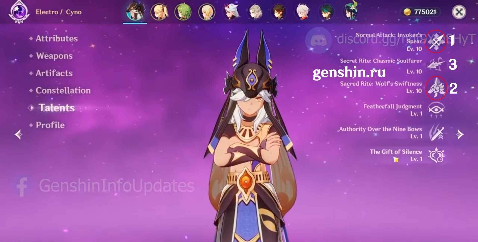 Теперь нам необходимо определить в каком порядке прокачивать навыки Сайно в Genshin Impact 3.1. Напоминаем, что Сайно у нас мейн ДД, который играется от Электро урона. Из всего этого следует, что мы прокачиваем все навыки до 6 уровня наравне, одинаково. После того, как все три навыка были прокачаны на 6 уровень делаем упор на Обычные атаки и Взрыв стихии (ульту), только после них беремся за элементальный навык (ешку):