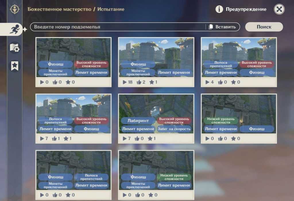 После публикации подземелья во вкладке Созданные его значок изменится. Также при нажатии откроется характеристика испытания, включающая тэги, количество ХП, условия, ограничения, объекты подземелья и историю. Под картой указан номер подземелья. Отправьте его другу, чтобы он мог пройти испытание.