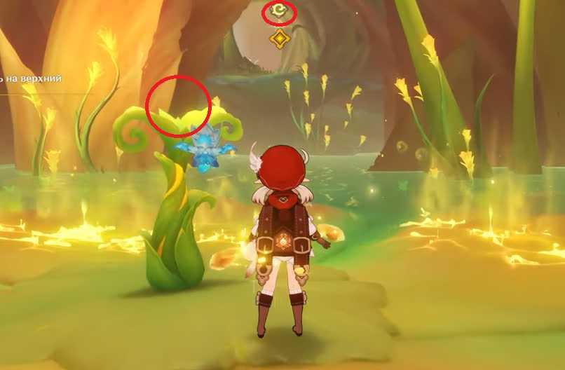 После бегите по метке, поднимайтесь по лифту и переноситесь обратно в дупло. Отправляйтесь на верхнюю платформу — для этого двигайтесь при помощи четырехлистных символов, которые будут на видном месте. Наверху сражайтесь с крупным монстром. Когда он включит щит, просто ждите начала диалога. После его окончания вы вернетесь из сна в Сумеру.