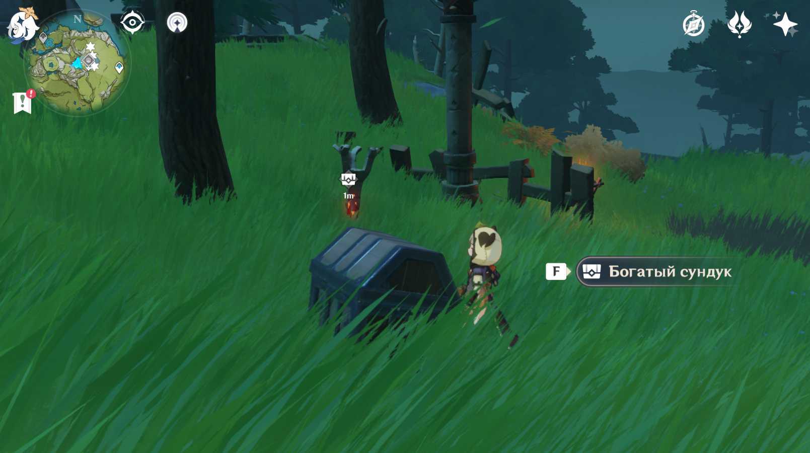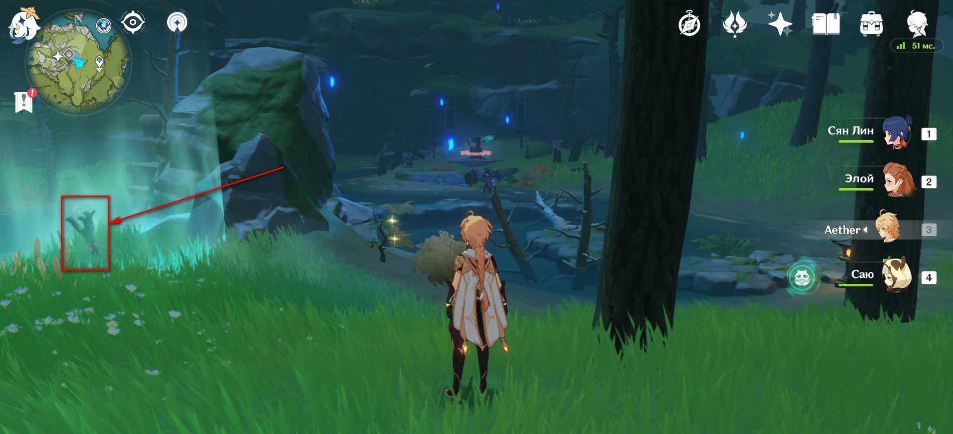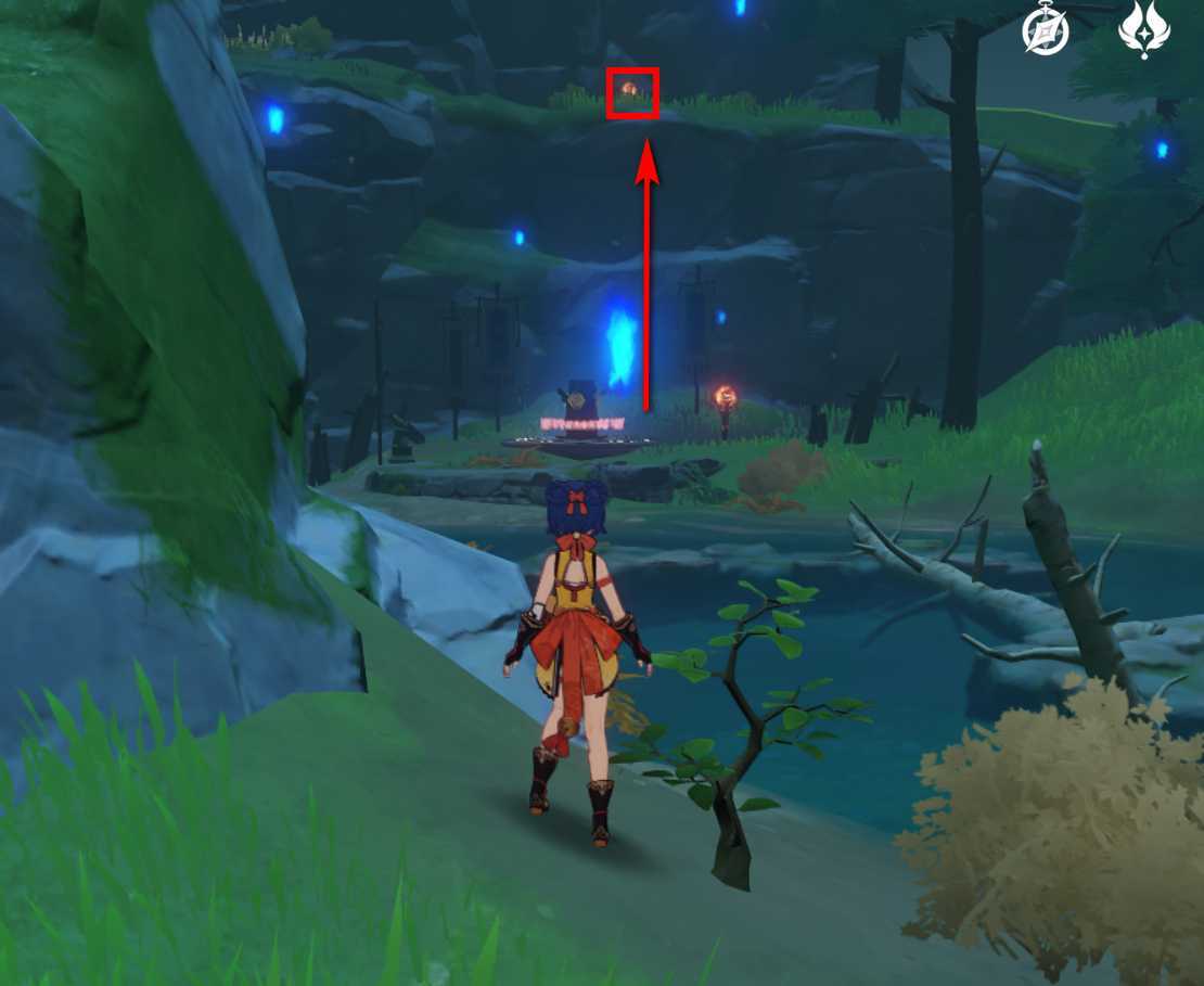 Первый факел стоит прямо возле тотема, второй – находится за Анемо барьером (через него можно пролететь, если спрыгнуть с выступа на юге), третий – возле скалы на севере, а четвертый – между деревьев и неподалеку от лагеря хиличурлов на западе.