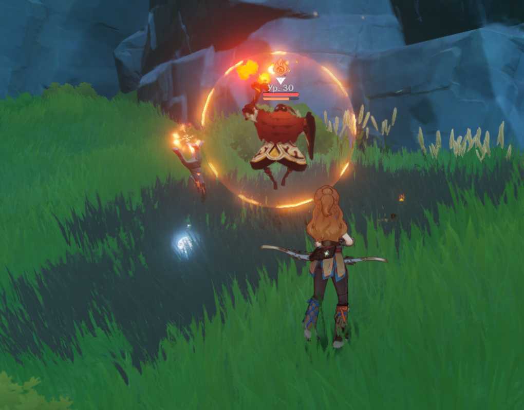 Для разблокировки дверей в данж вам необходимо будет взаимодействовать с Гео монументом, находящимся под красным барьером. Чтобы убрать эту преграду, вам предстоит зажечь четыре факела (ударьте по ним Пиро атаками), расположенные неподалеку и отмеченные феей. Если вы упустили духа из виду, то просто взгляните на скриншоты ниже.