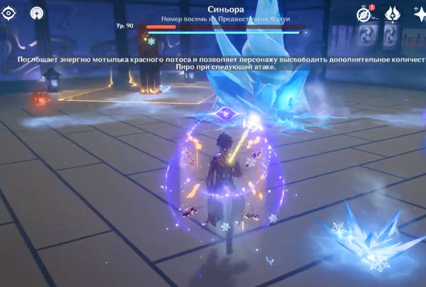 Как только лед будет разбит, Синьора примет пиро стихию и теперь на игрока уже будет действовать пылающий жар, который точно также, как и лютый мороз будет снимать хп персонажа. Снять эффект можно гидро сосудом, которые также расставлены по углам. Иногда она будет призывать огненный вихрь, который ускорит накопление жара при попадании в него.