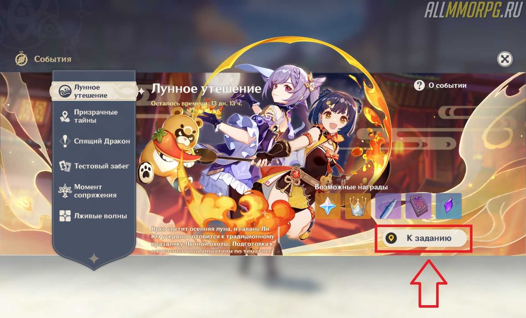 Чтобы приступить к выполнению стартового квеста, откройте меню событий и найдите баннер ивента «Лунное утешение» (первый в списке). На нем в правом нижнем углу будет кнопка «Приступить к заданию».