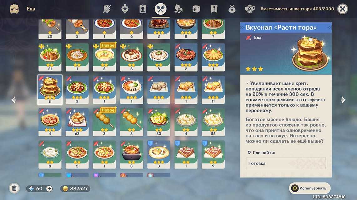 Чтобы не усиливать параметры едой, лучше стараться соблюдать баланс между шансом крита, критическим уроном и силой атаки. Эти параметры важны для всех персонажей; теряя что-то одно, вы уменьшите или базовый дамаг, или урон от элементальных атак.