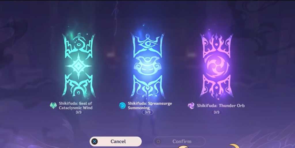 - Печать порывов. На поле боя появляется анемо-дух, который стягивает к себе всех врагов в комнате. Эффект печати длится 6 секунд. По окончанию времени действия или сразу после уничтожения анемо-дух создает волну энергии, которая наносит урон от стихии Анемо и подкидывающую монстров в воздух. Одновременно можно использовать только одну Печать порывов.