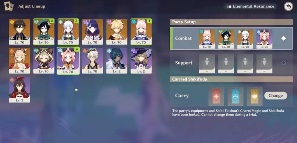 На картинках ниже показаны оптимальные отряды для боя и резерва. Отметим, что вам придется сражаться с большим количеством мобов, относящихся к разным стихиями, поэтому против них лучше всего использовать героев нейтральных элементов, таких как Гео и Анемо.