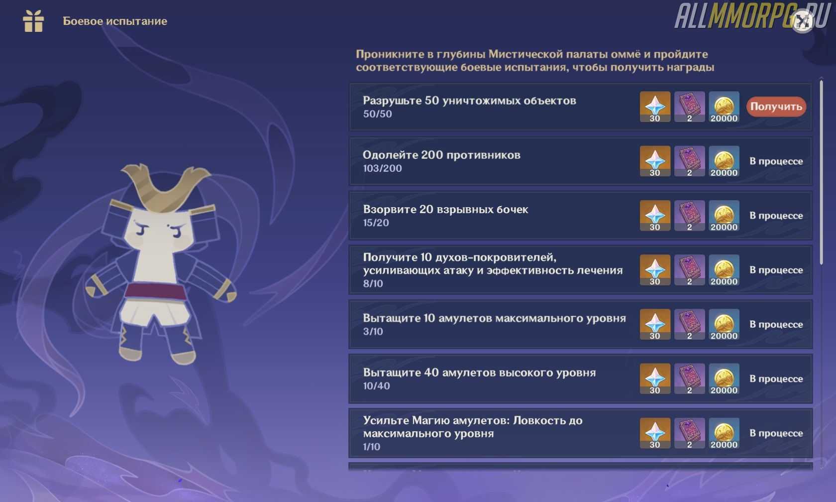 Получите Primogems, Hero’s Wit и Mora за прохождение испытаний с определенными параметрами. Победить X противников, Уничтожить X объектов/бочек и Вытянуть X талисманов суммируются за несколько прохождений (награды выдаются один раз за всю комнату Mystic Onmyou).