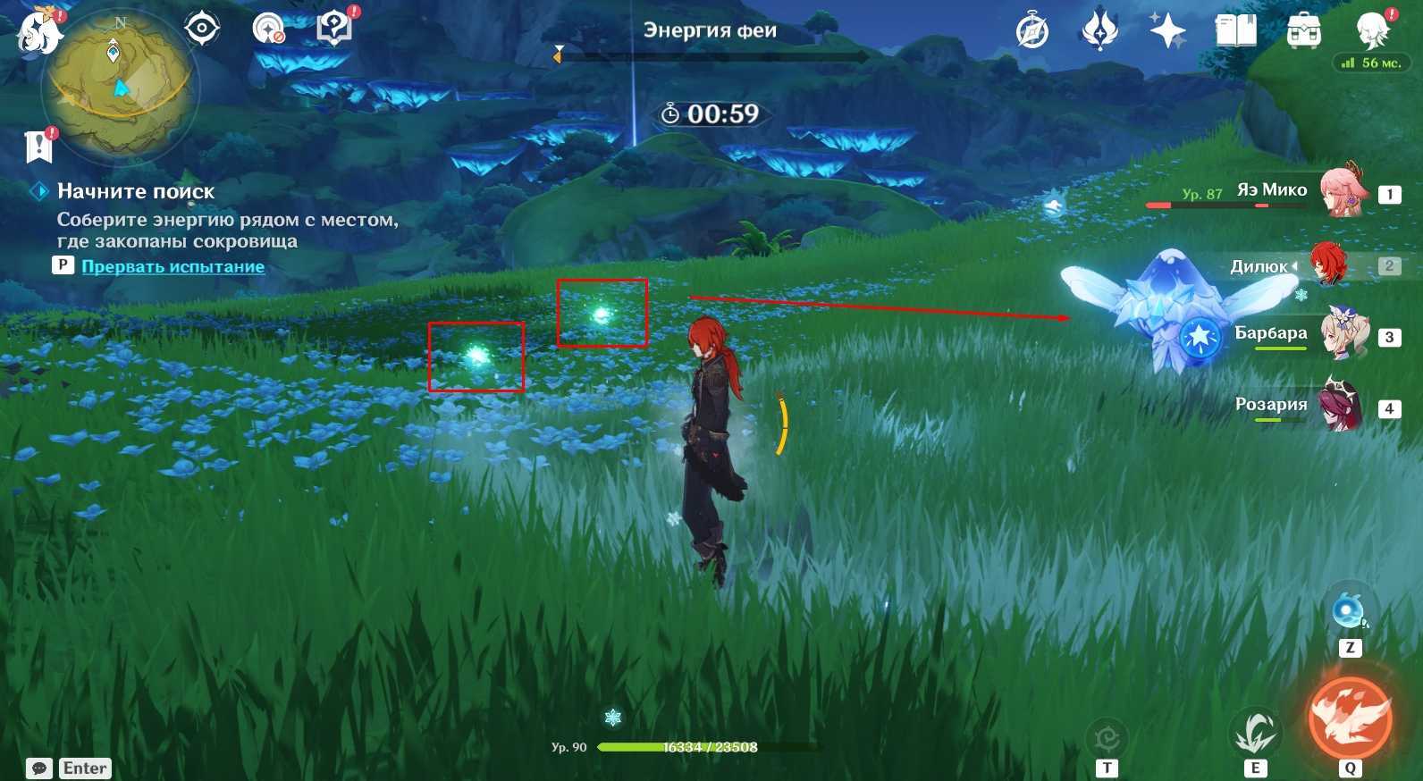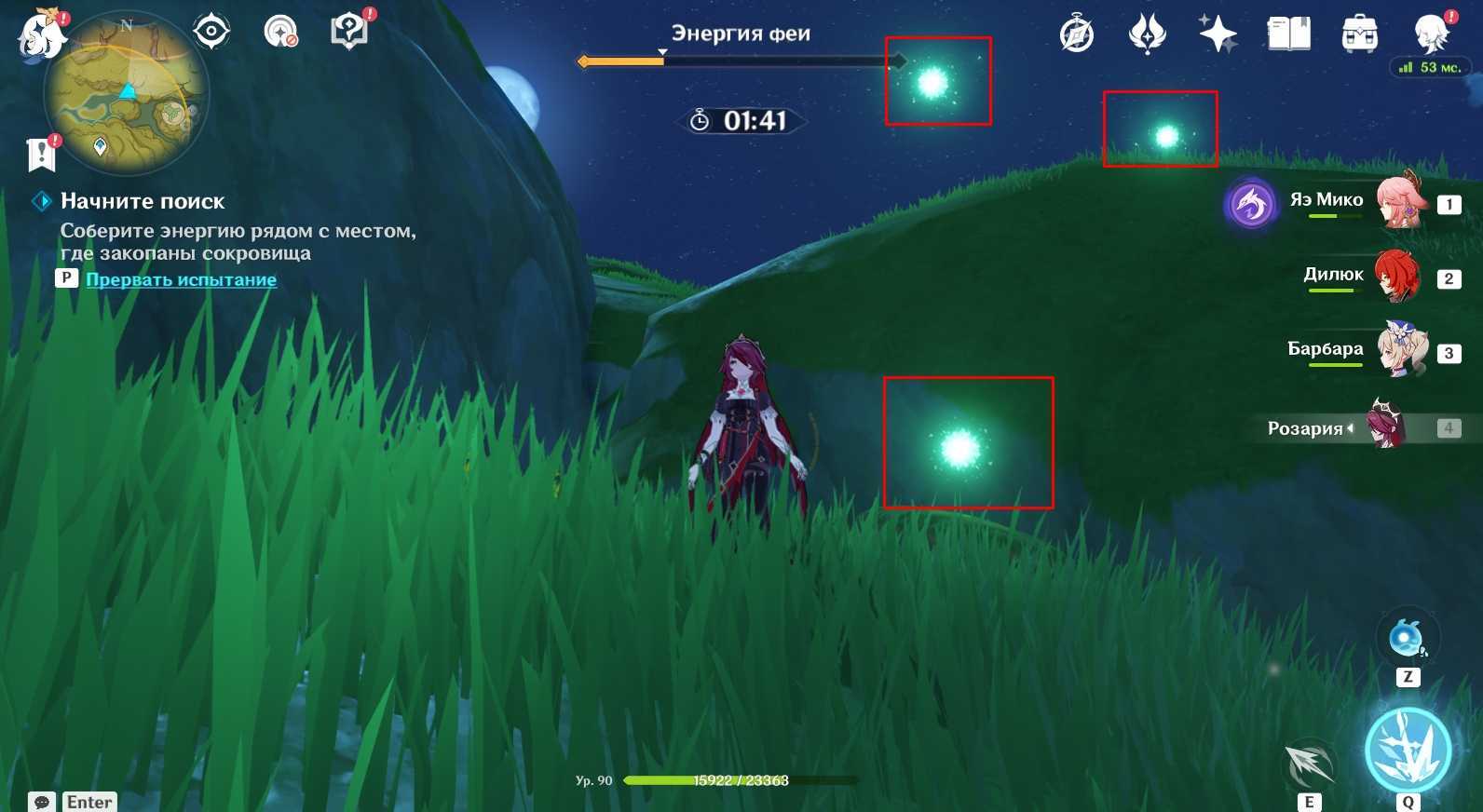 На карте ниже продемонстрировано расположение всех элементальных частиц энергии и разных испытаний, решение которых открывает доступ к сундукам. Как только вы соберете 3 энергетические сферы, фея укажет, где находится ближайшее сокровище (на карте появится иконка с лопатой). Однако вы можете продолжить сбор стихийных частичек, чтобы сразу найти все 3 испытания и пройти их. Далее мы более подробно рассматрим каждое испытание.