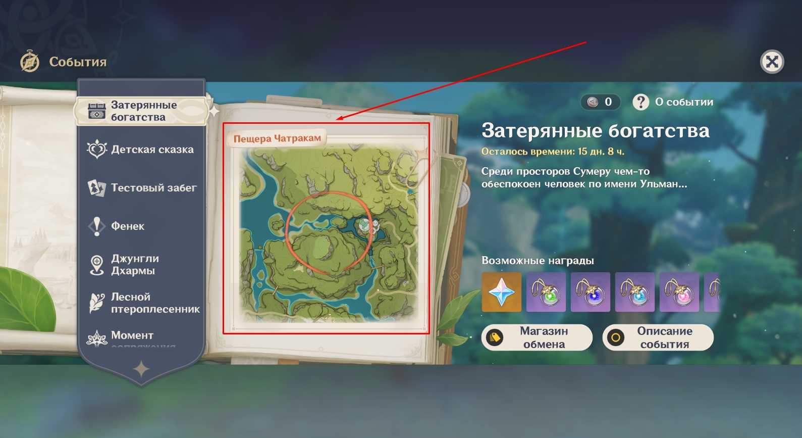 | 1 | Откройте баннер события и посмотрите, какую область вы можете исследовать сейчас. Первой будет Пещера Чатракам, которая находится на севере от столицы региона. Телепортируйтесь в эту область, чтобы приступить к поиску сокровищ | ![]() |