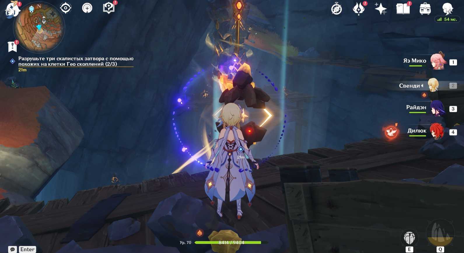 - Следующий шаг – разрушить скалистый затвор. Чтобы сделать это, вам необходимо осмотреться вокруг и отыскать странные Гео скопления. После надо подобрать особую Гео руду и получить бафф, который позволит активировать Гео скопления и использовать их для разрушения скалистого затвора. Подобнее об этом мы рассказали ниже: