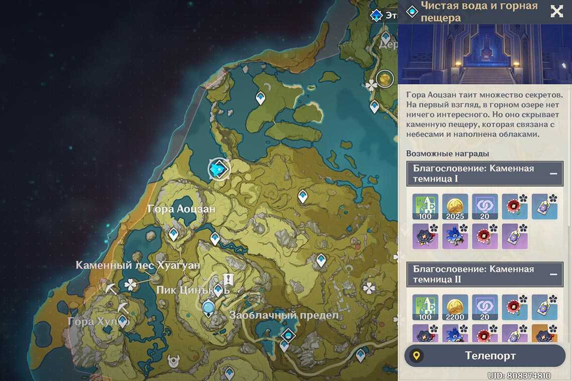 Чтобы собрать комплект пятизвёздочных (золотых) артефактов из сета «Рыцарь крови» в Genshin Impact, вам необходимо добраться до горы Аоцзан в Ли Юэ. К северу от неё находится озеро, рядом с которым скрывается данж под названием «Чистая вода и горная пещера». Активируйте его и победите врагов внутри, чтобы добыть артефакты, золото, опыт приключений и очки дружбы. Точное местонахождение подземелья смотрите на картинке ниже: