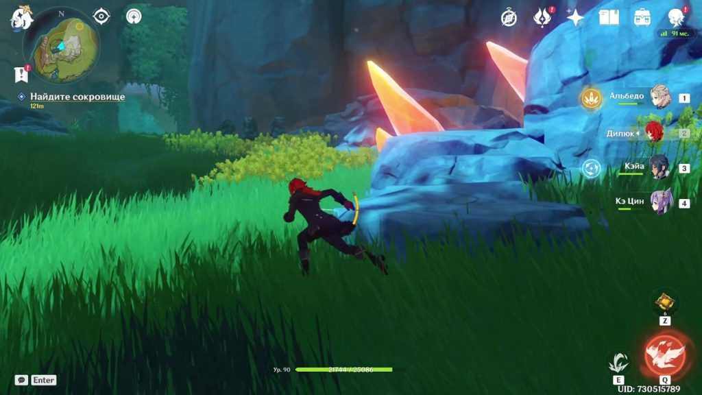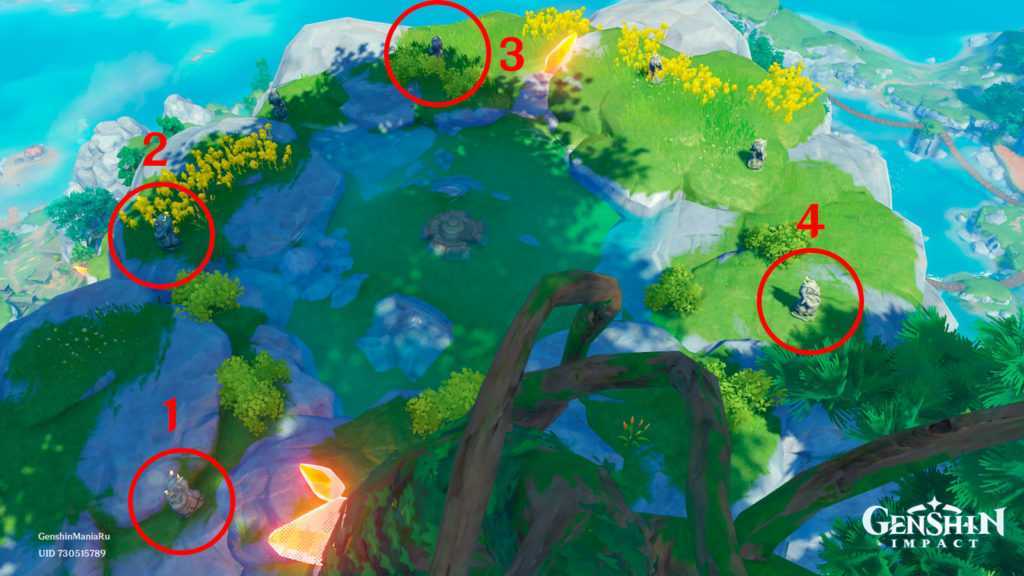 Двадцатый почти на виду, но осторожно: рядом с ним хиличурлы. Убивать их необязательно, но они могут сагриться на вас.