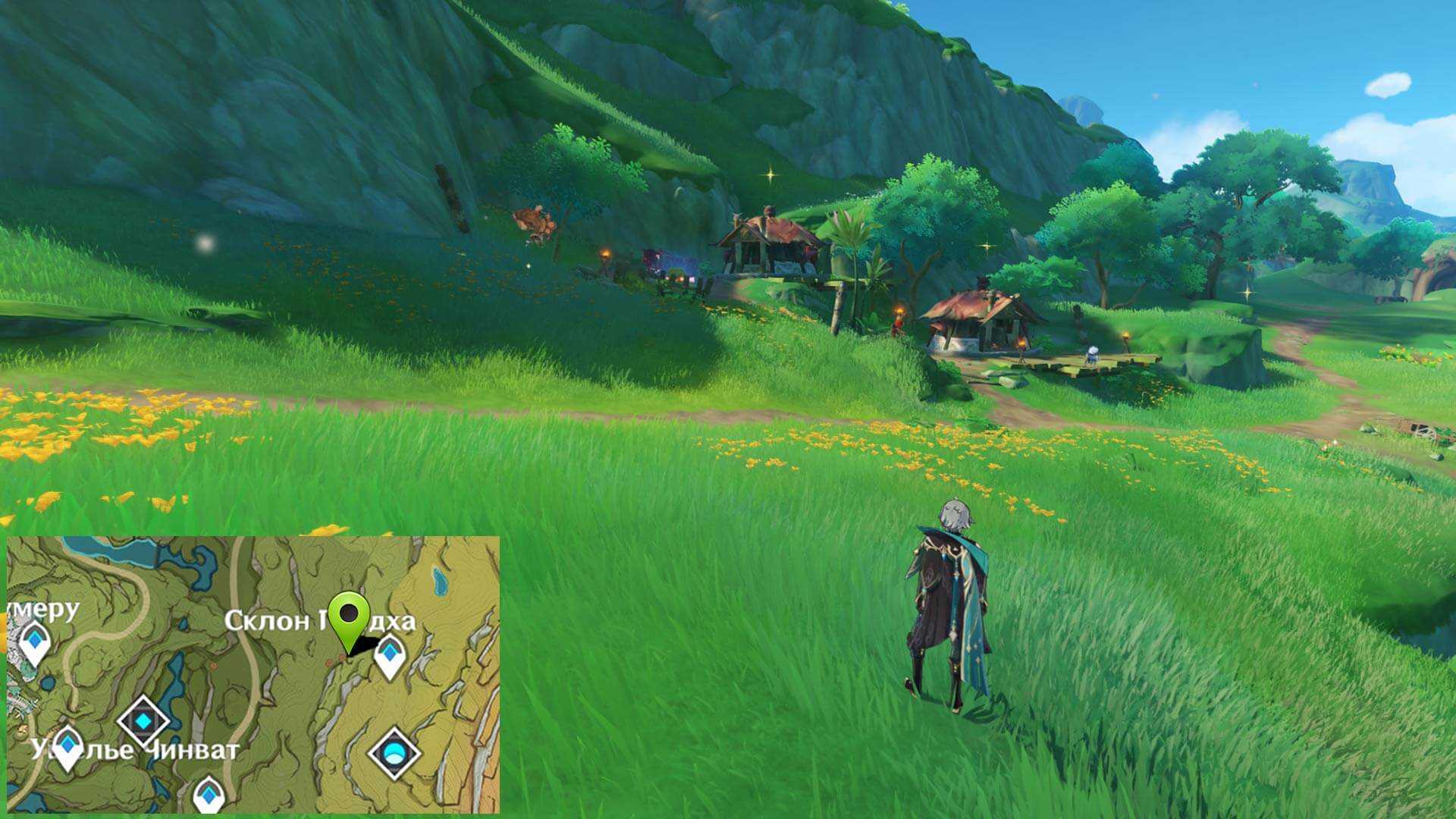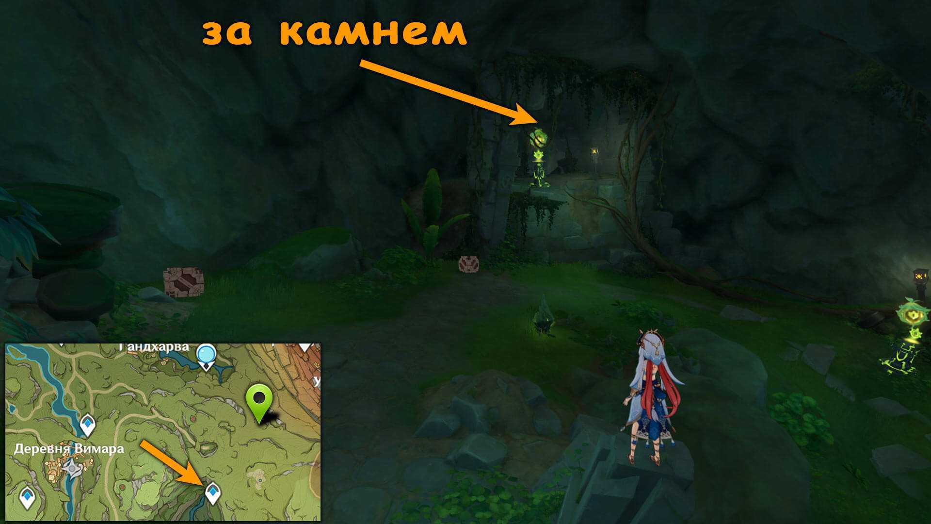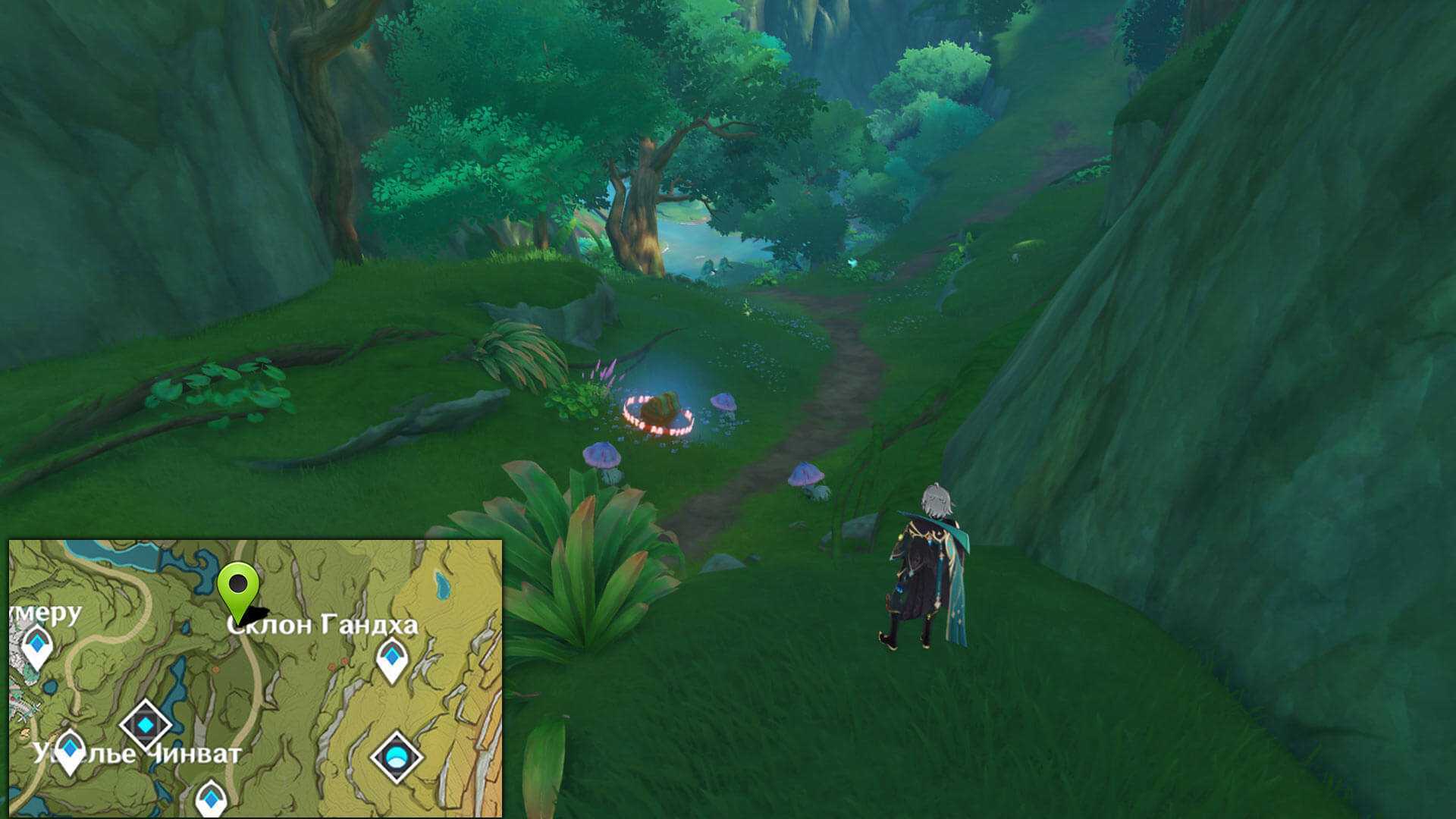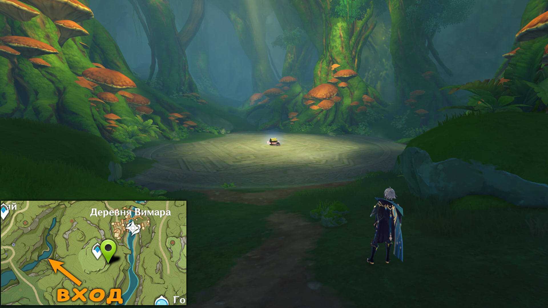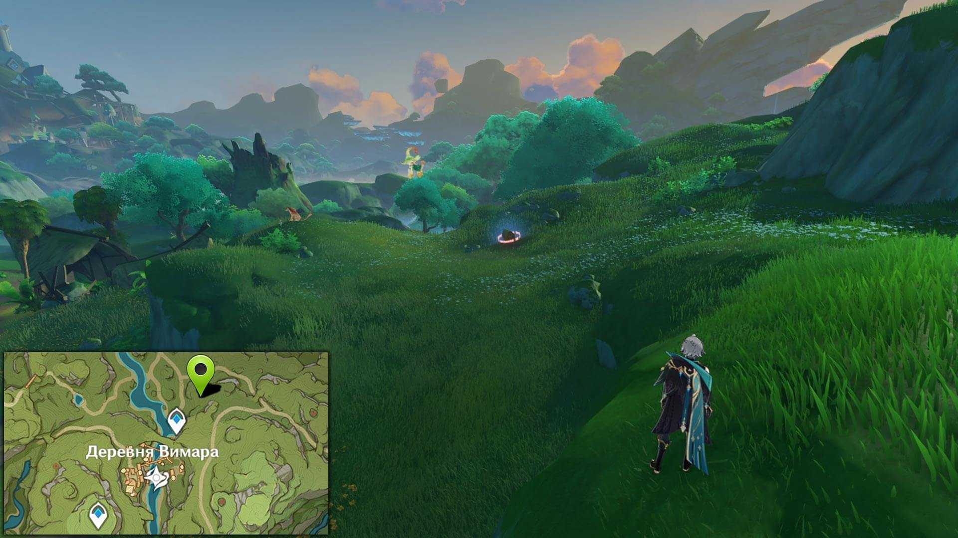 Перемещаемся к Точке телепортации на горе возле деревни Вимара и бежим на запад к реке. Находим вход в пещеры, где мы проходили задание Пока вана не исцелится, и бежим до большой площади с сундуком и хиличурлом.