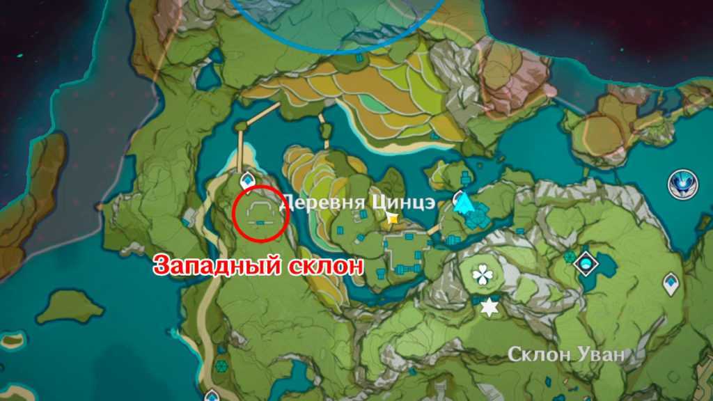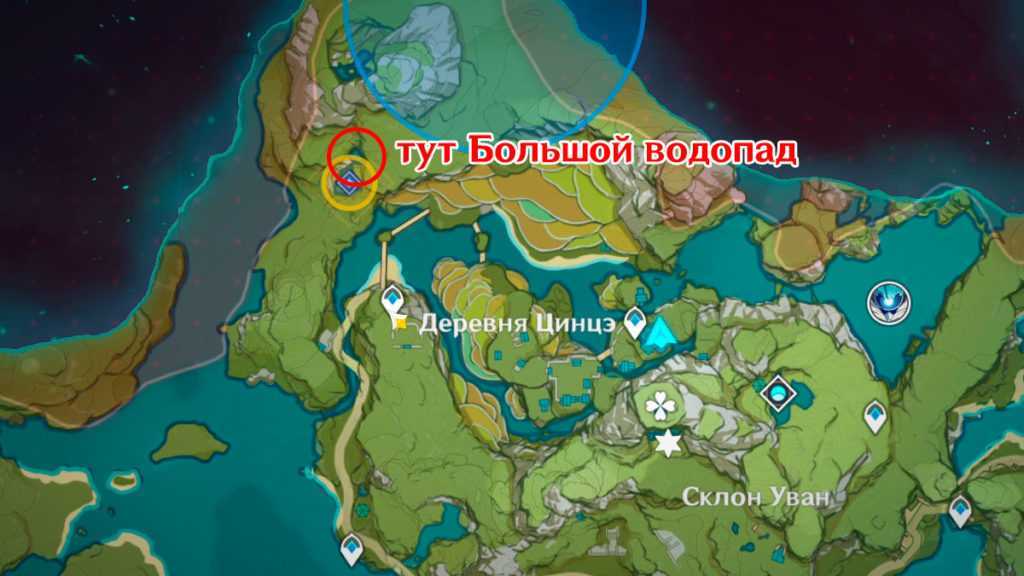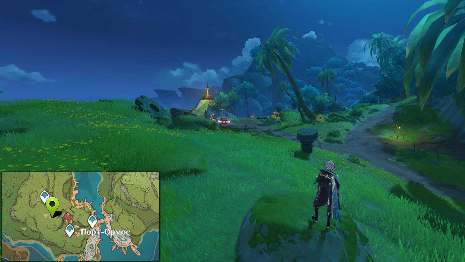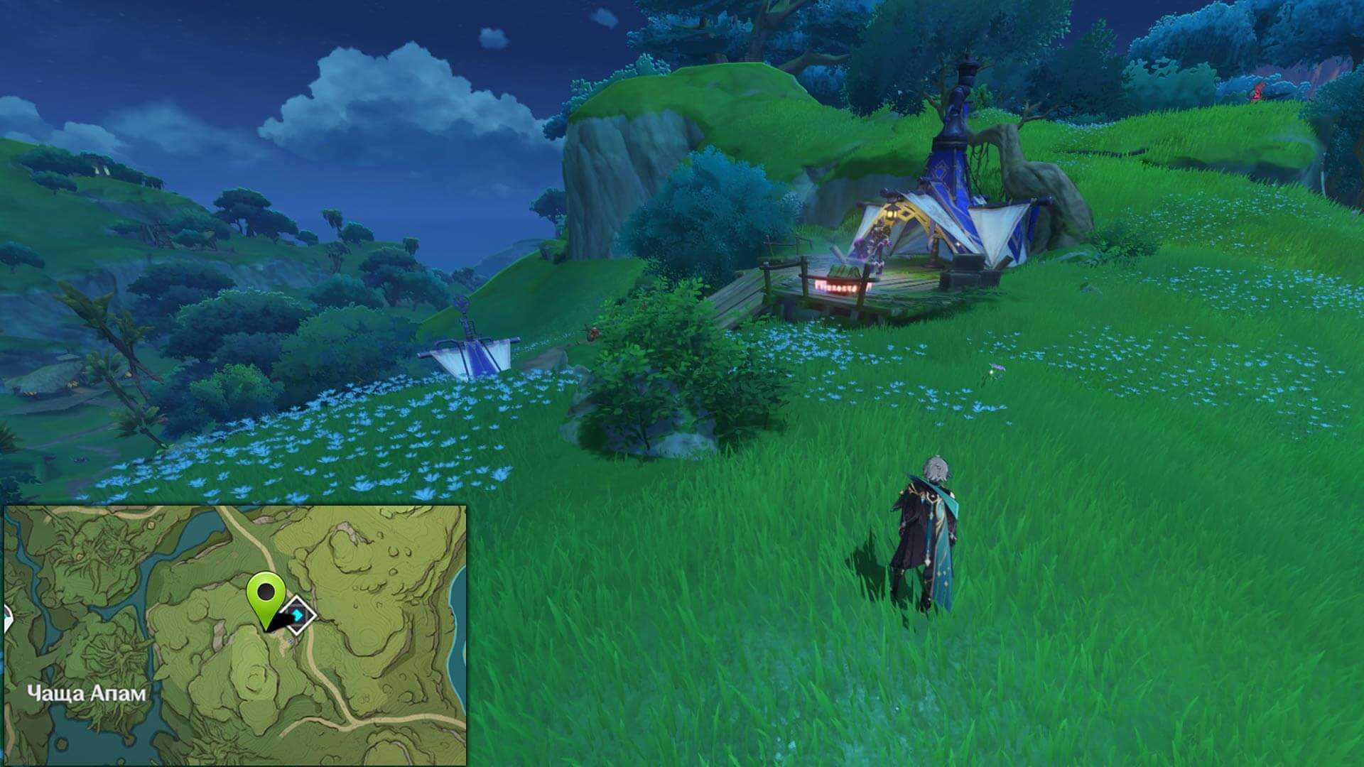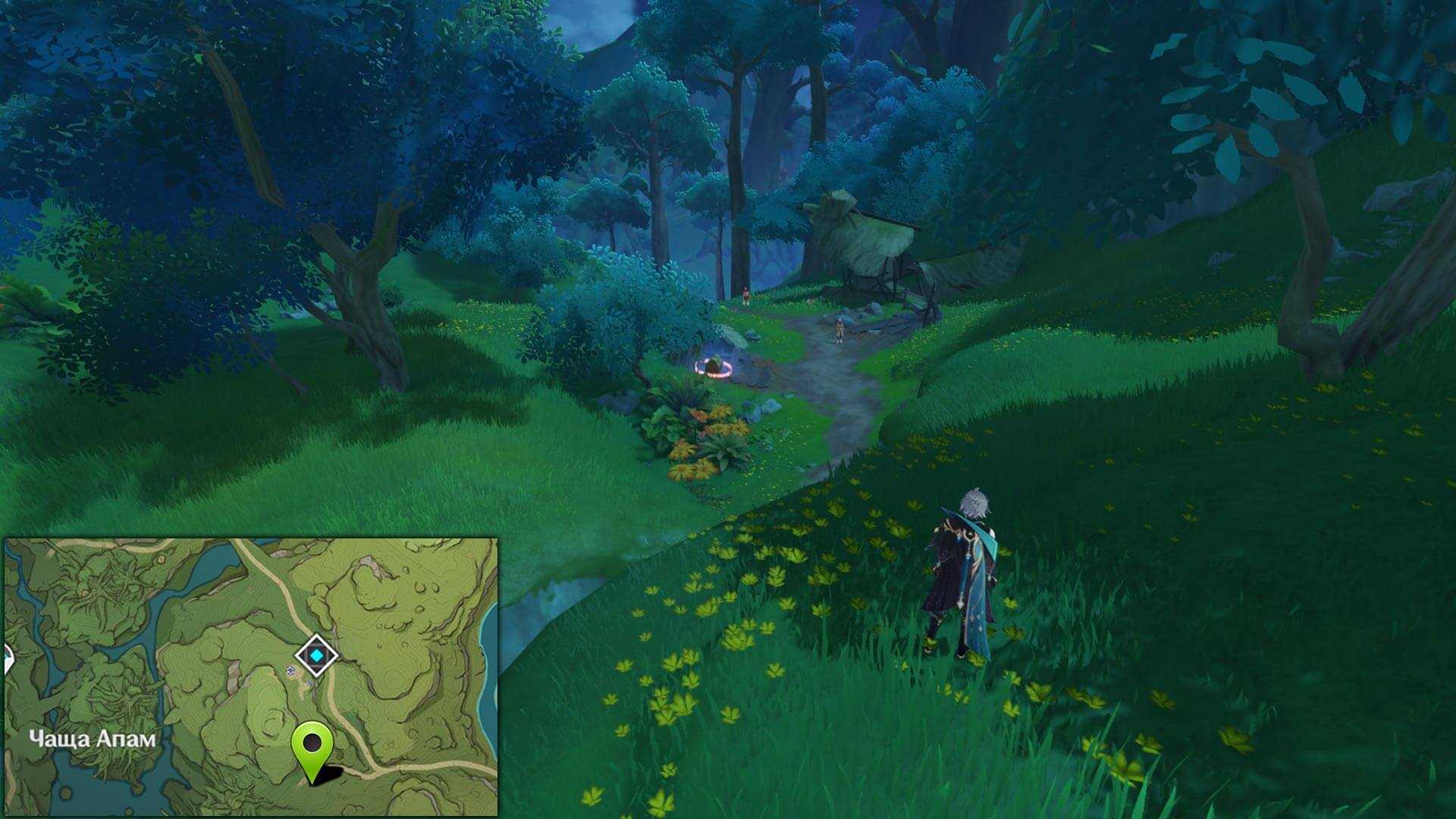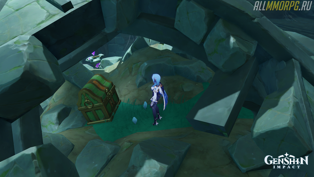 Перемещаемся к Точке телепортации на горе возле деревни Вимара и бежим на запад к реке. Находим вход в пещеры, где мы проходили задание Пока вана не исцелится, и бежим до большой площади с сундуком и хиличурлом.