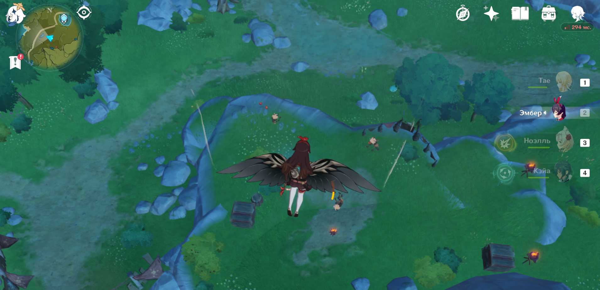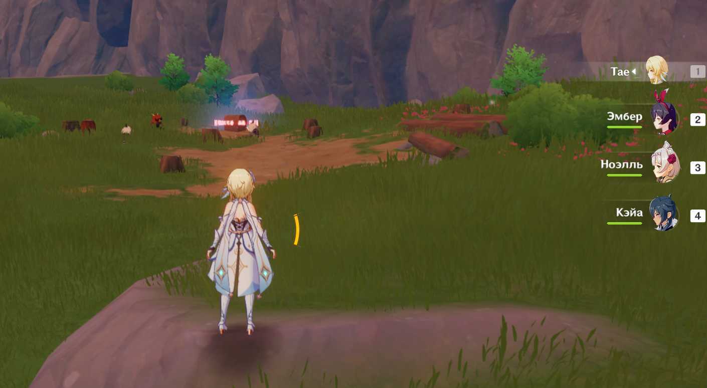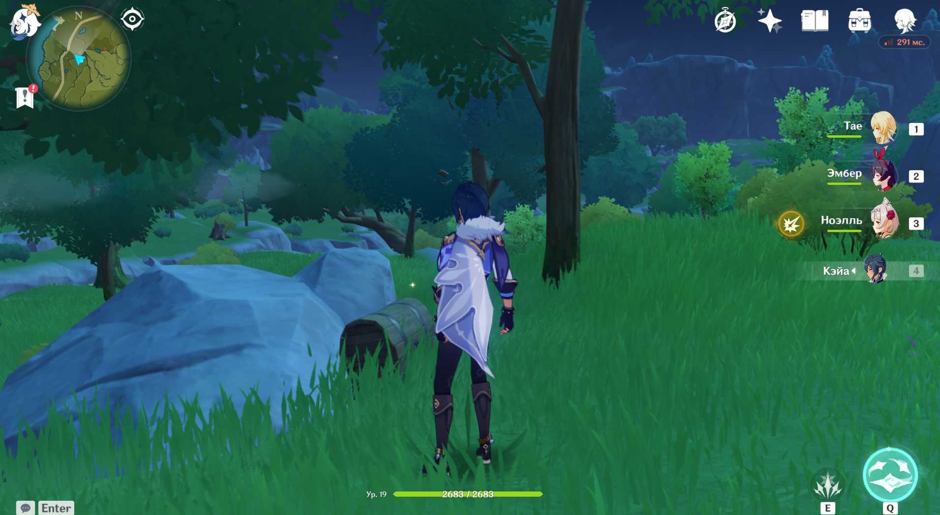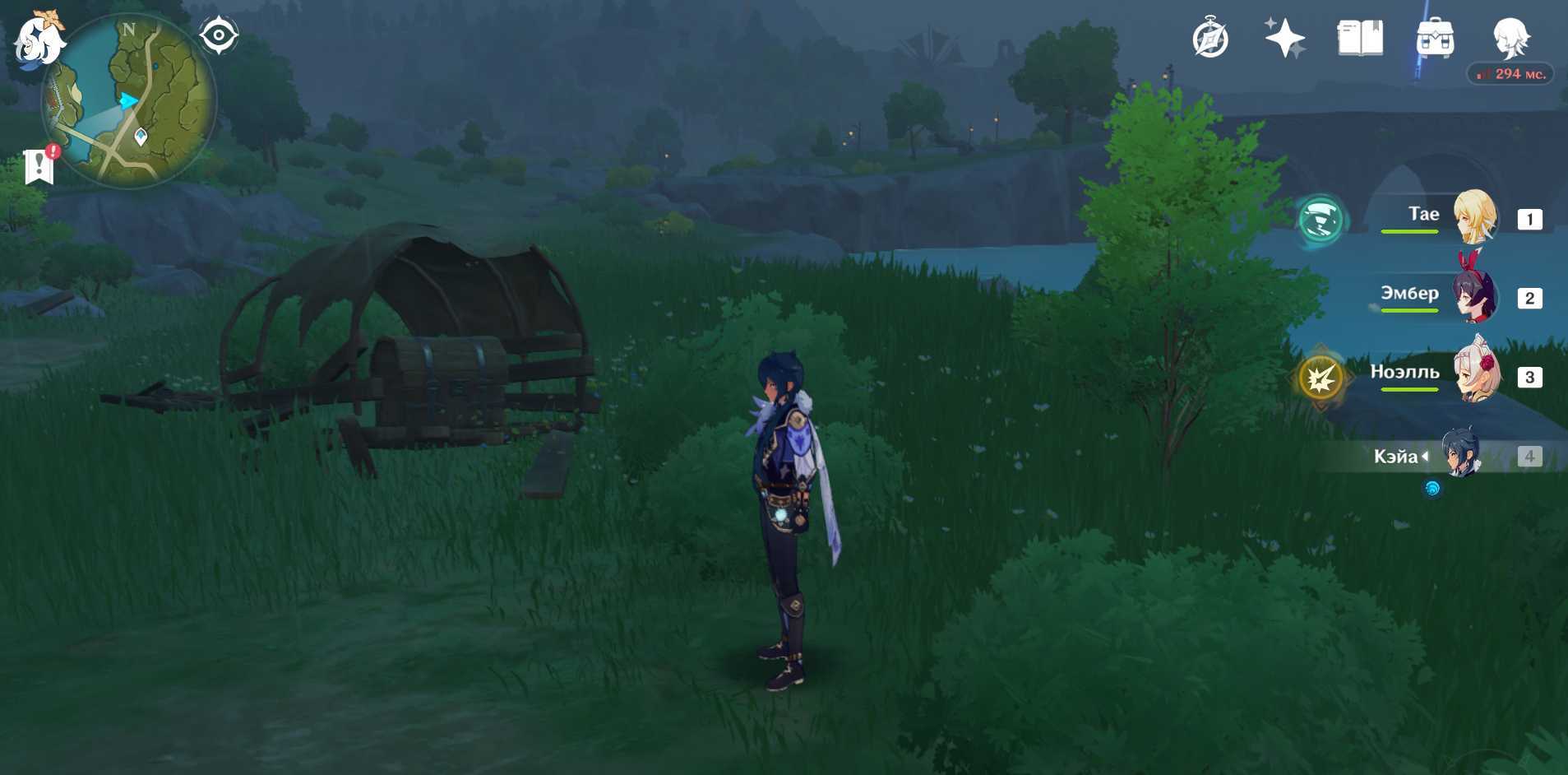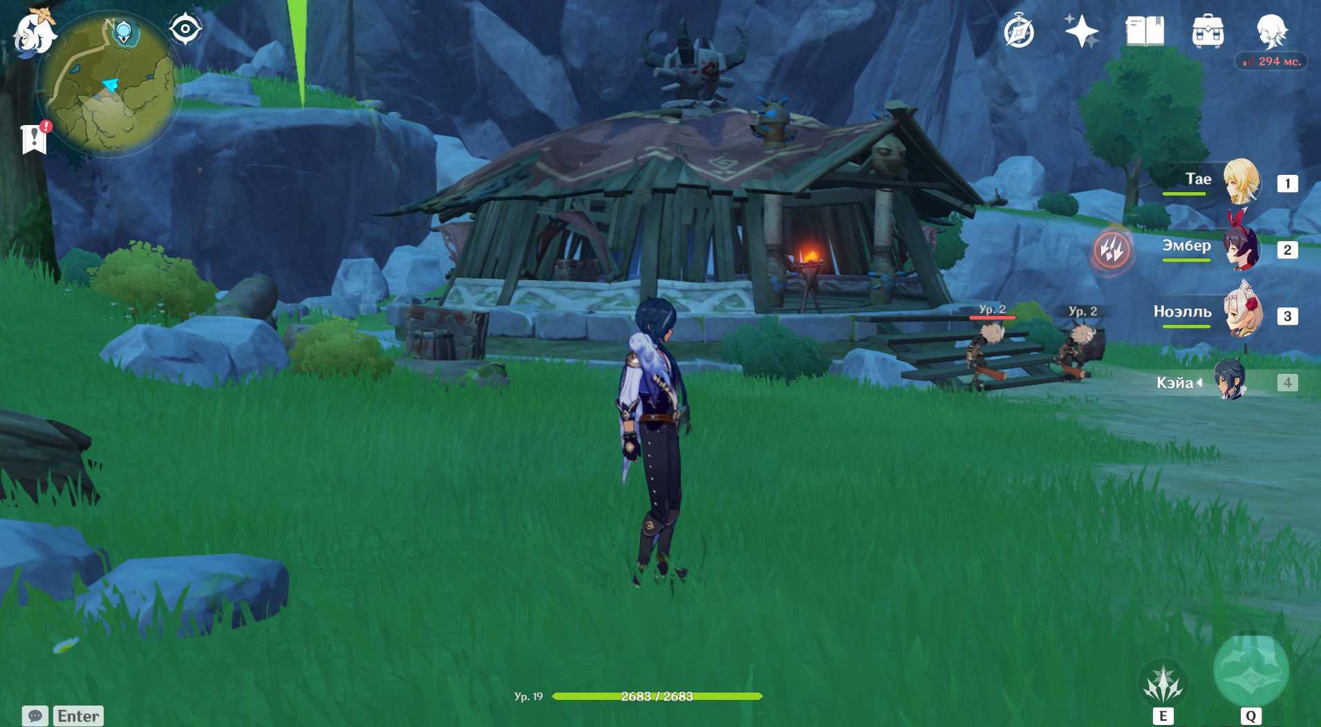Перемещаемся к Точке телепортации на горе возле деревни Вимара и бежим на запад к реке. Находим вход в пещеры, где мы проходили задание Пока вана не исцелится, и бежим до большой площади с сундуком и хиличурлом.